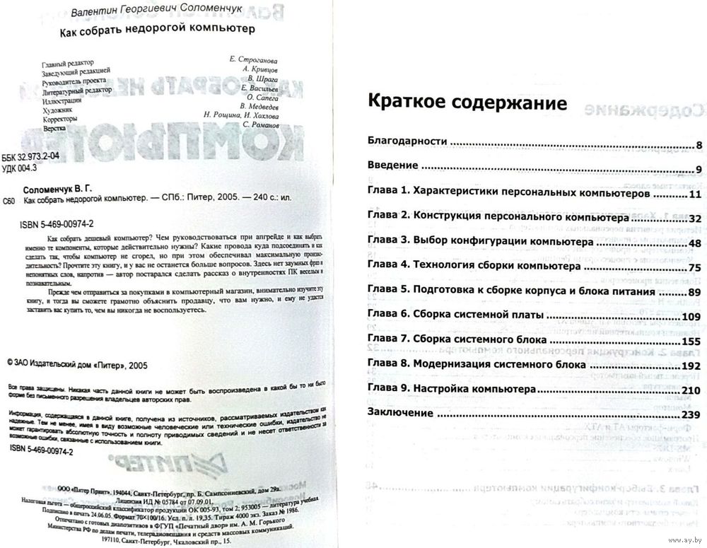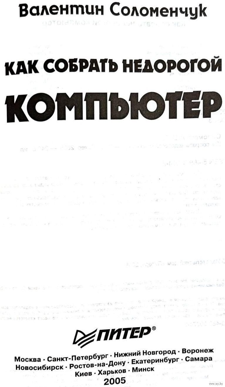 Книга «Как собрать недорогой компьютер» (автор — Валентин Георгиевич Соломенчук) представляет собой практическое руководство для начинающих пользователей, которые хотят самостоятельно создать функциональный ПК с минимальными затратами. Автор объясняет, как собрать полноценную «рабочую лошадку», не переплачивая за бренд или избыточные характеристики готовых магазинных сборок. В книге рассматриваются базовые элементы ПК: процессоры, материнские платы, оперативная память, накопители (HDD/SSD), видеокарты и блоки питания. Пошагово описывается процесс монтажа деталей в корпус, установка систем охлаждения и подключение кабелей. Помимо физической сборки, уделяется внимание базовой настройке системы для стабильной работы. Книга ориентирована на новичков («самоучитель»), написана простым и доступным языком