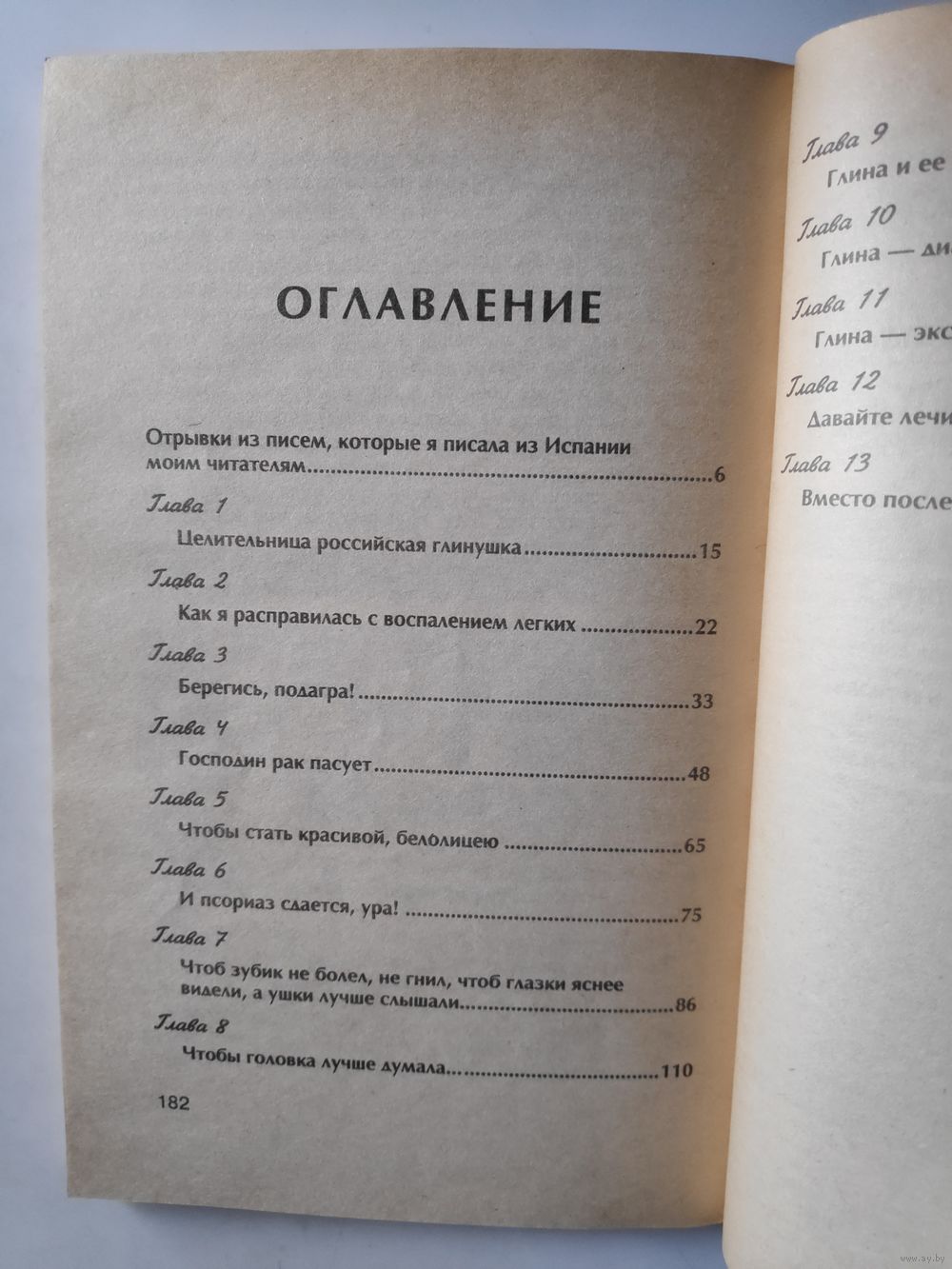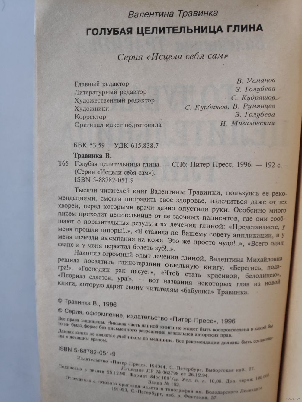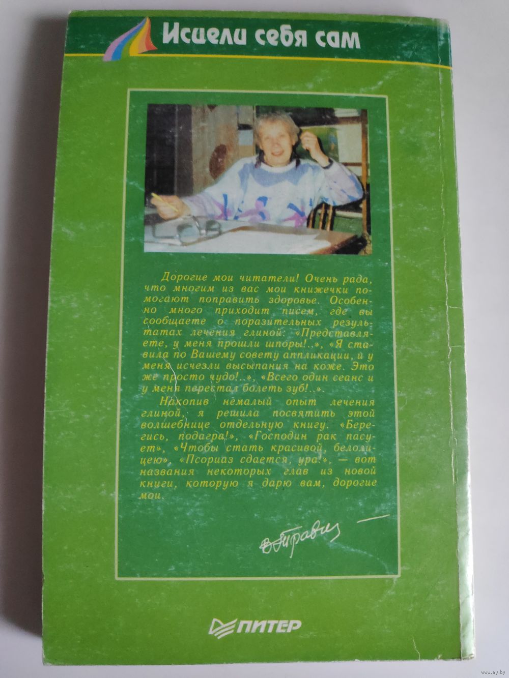 Тысячи читателей книг Валентины Травинки, пользуясь ее рекомендациями, смогли поправить свое здоровье, излечиться даже от тех хворей, перед которыми врачи давно опустили руки. Особенно много писем приходит целительнице от ее заочных пациентов, где они сообщают о поразительных результатах лечения глиной: "Представляете, у меня прошли шпоры!", "Я ставила по Вашему совету аппликации, и у меня исчезли высыпания на коже. Это же просто чудо!..", "Всего один сеанс и у меня перестал болеть зуб!..". Накопив огромный опыт лечения глиной, Валентина Михайловна решила посвятить глинотерапии отдельную книгу. "Берегись, подагра!", "Господин рак пасует", "Чтоб стать красивой, белолицею", "Псориаз сдается, ура!", - вот названия некоторых глав из новой книги, которую дарит своим читателям "бабушка" Травинка.