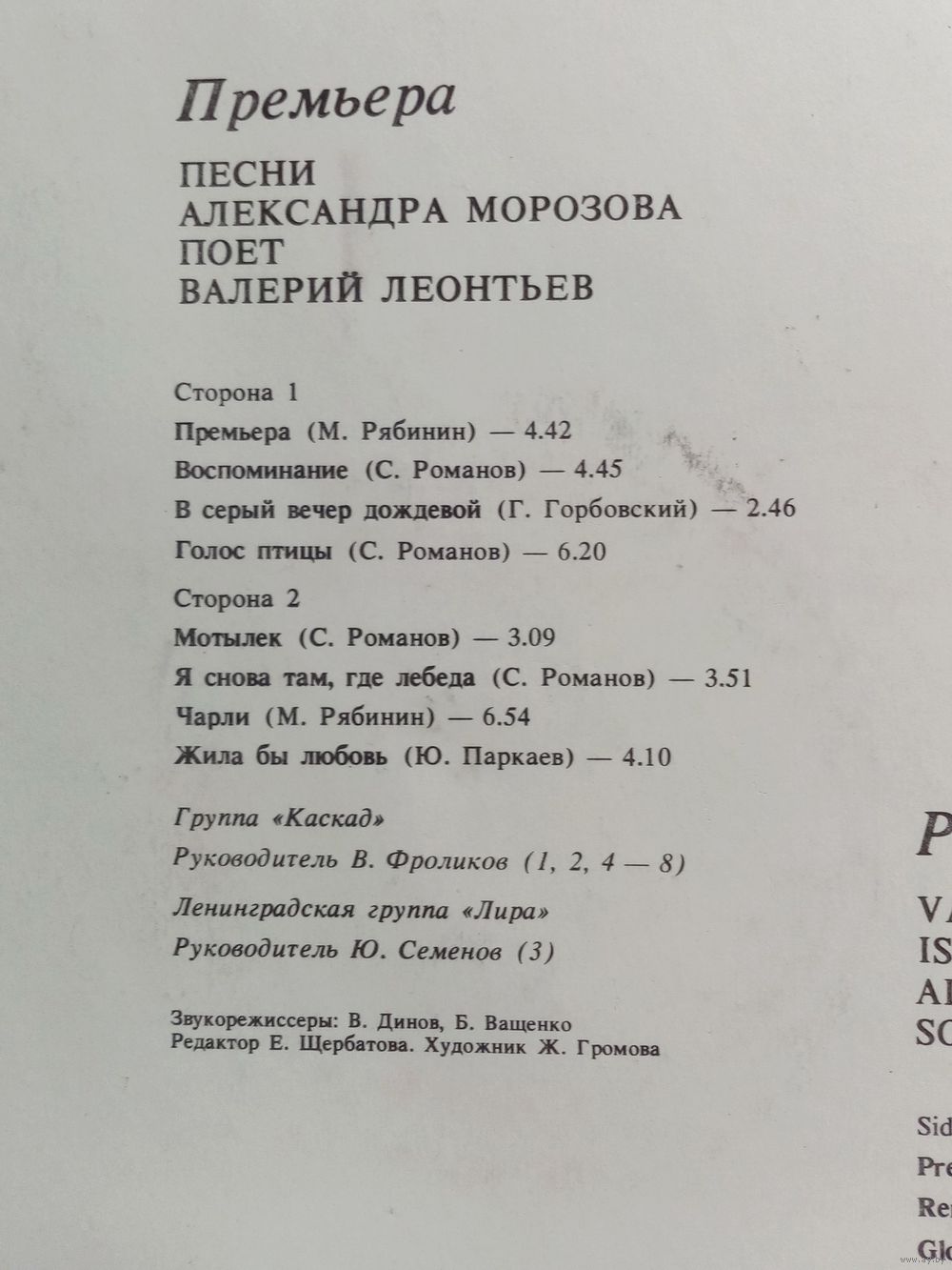 Валерий Леонтьев. Премьера. Песни Александра Морозова. LP 1984