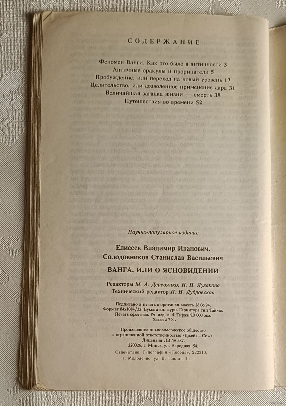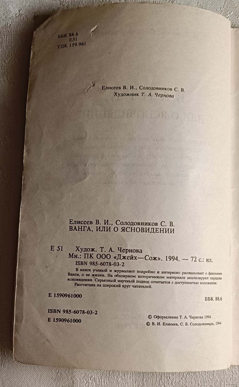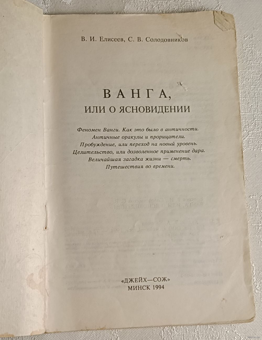 Ванга, или о ясновидении. Елисеев В. И., Солодовников С. В. Мн.: ПК ООО «Джейх-Сож». 1994. 72 с.: ил., мягкая обложка.