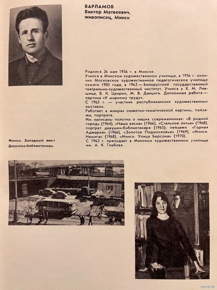 Варламов Виктор Матвеевич (1936 – 1996). Родился в Минске. Профессиональное образование: 1956 г. – Московское художественное училище памяти 1905 г., 1962 – Белорусский театрально-художественный институт. С 1963 г. – участник художественных выставок. Работал в живописи в жанрах пейзажа, портрета и сюжетно-тематической картины. Картины находятся в Национальном художественном музее Беларуси, фонде Союза художников РБ, частных коллекциях на родине и за рубежом. 1962-79 – преподавал в Минском художественном училище. С 1967 – член Союза художников СССР.