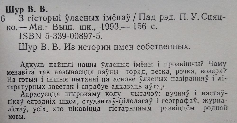 Васіль Шур. З гісторыі ўласных імёнаў. Мінск : Вышэйшая школа, 1993 г. 154 с. Мяккая вокладка.