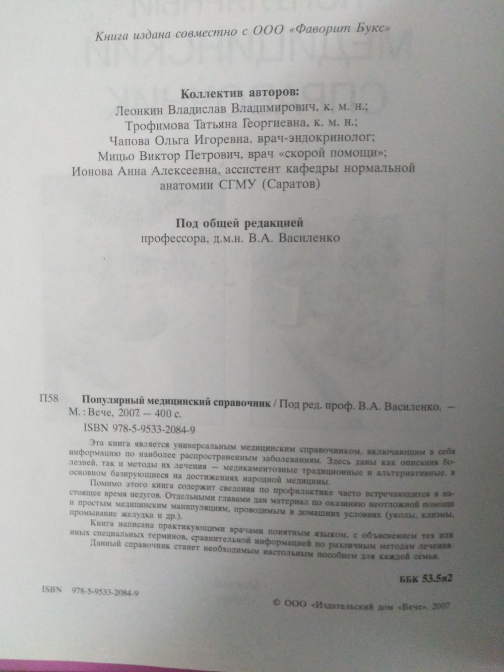 Книга является универсальным медицинским справочником, включающим в себя информацию по наиболее распространенным заболеваниям. Здесь даны как описания болезней, так и методы их лечения-медикаментозные традиционные и альтернативные, в основном базирующиеся на достижениях народной медицины.