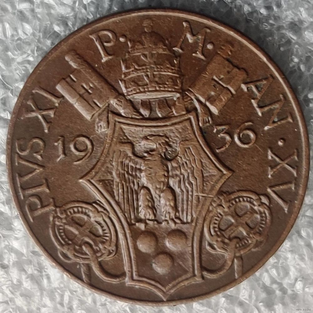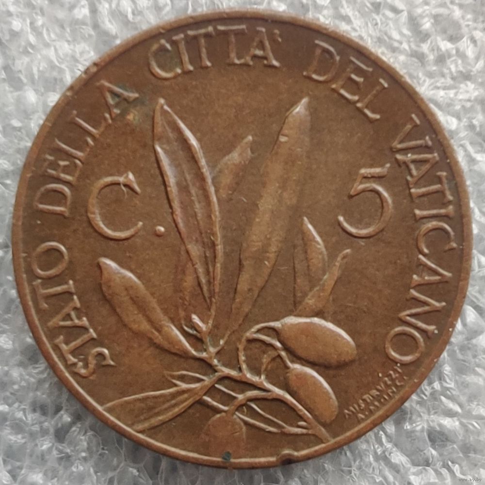 Номер KM # 1 Страна Ватикан Период Папа Пий XI (1929 - 1938) Правитель Пий XI Валюта Ватиканская лира Вид чекана Регулярный чекан Номинал 5 чентезимо Год 1929 - 1937 Гурт Гладкий Форма Круг Отношение авс/рев Монетное (180°) Материал Бронза Вес (g) 3,3 Диаметр (mm) 19,6 Толщина (mm) 1,56