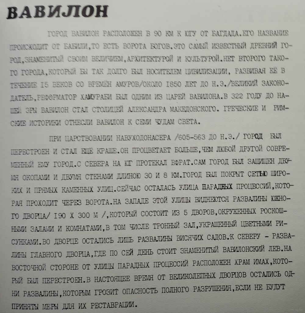 Отпечатано в Ираке. Большой формат. Издание иракского министерства культуры. Пенталингва - на рус. и др. яз. В книге показаны роль и место Древнего Вавилона в развитии мировой цивилизации. Издание содержит иллюстрации, реконструкции, уникальные исторически достоверные карты.
