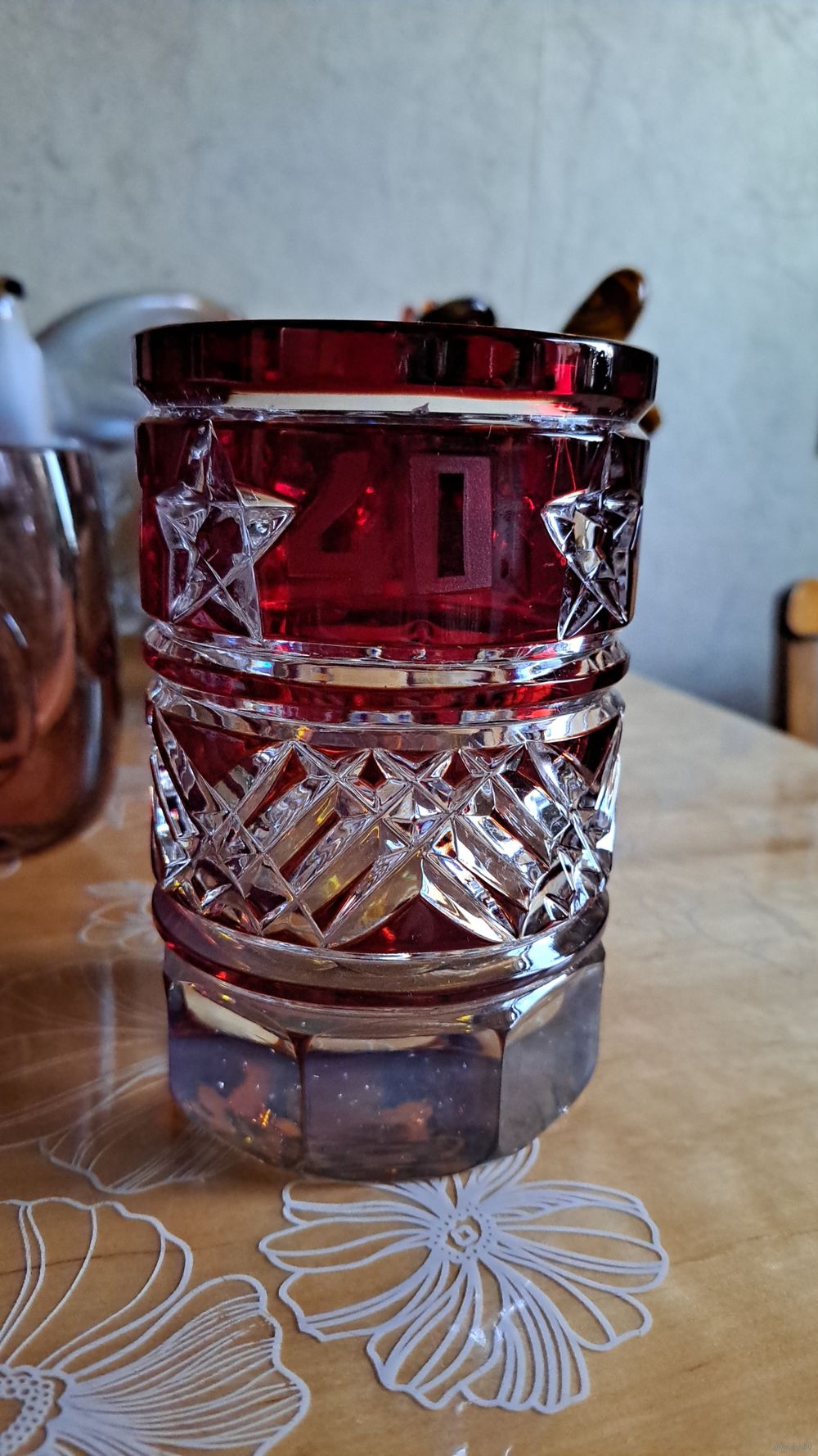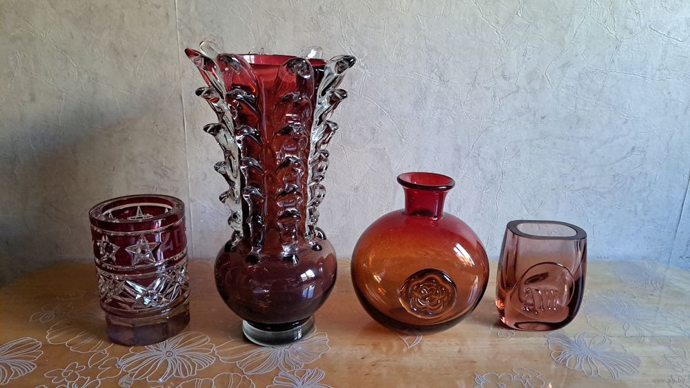 Высота вазы 13 см, диаметр 9 см. Толщина стекла 1 см. Ваза сложная в исполнении. На прозрачном хрустале красный нацвет, дно вазы янтарного оттенка. Аналогов найти не удалось, но работа выполнена опытным мастером (мастерами). Неман?