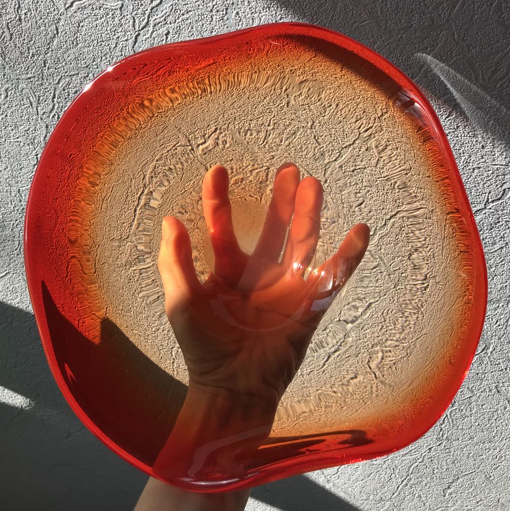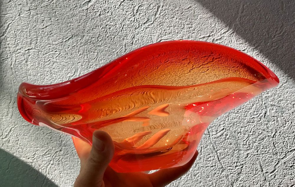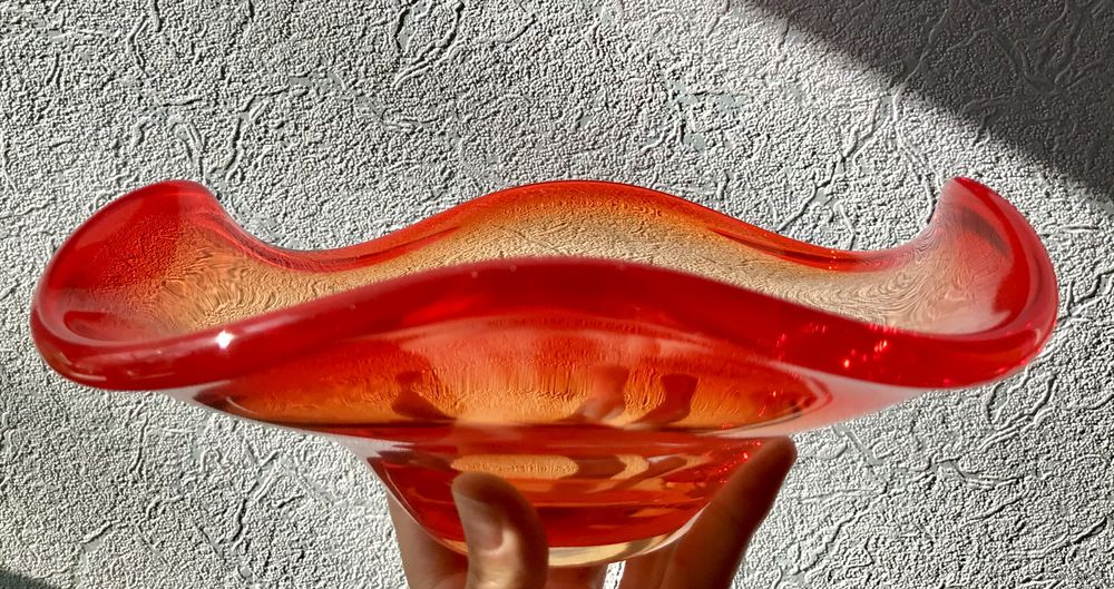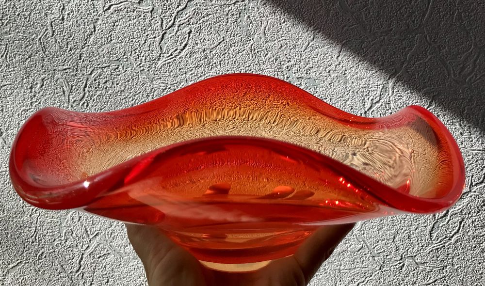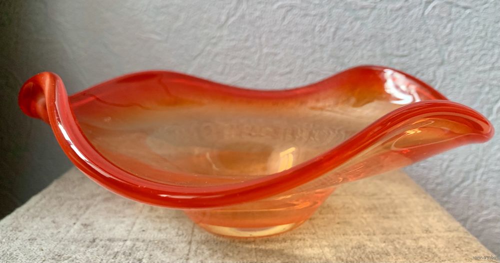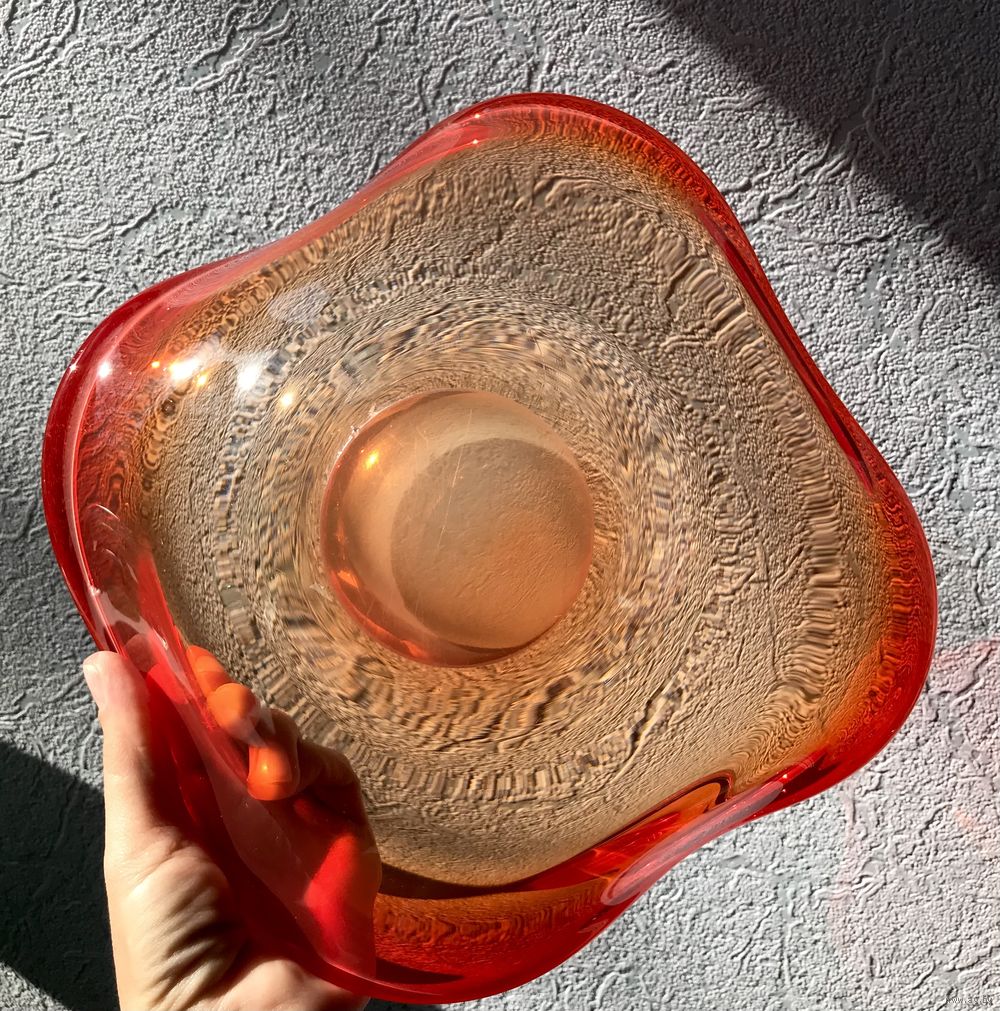 Винтажная ваза (фруктовница, конфетница) из цветного стекла в гутной технике. Высота 9см., размер 22х23см., шлифованное дно (сбоку на дне есть незначительный скольчик). Общее состояние хорошее.