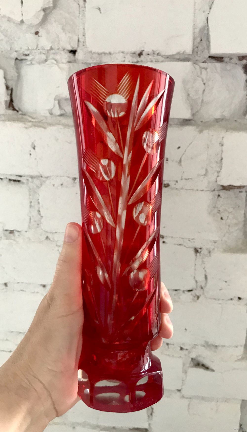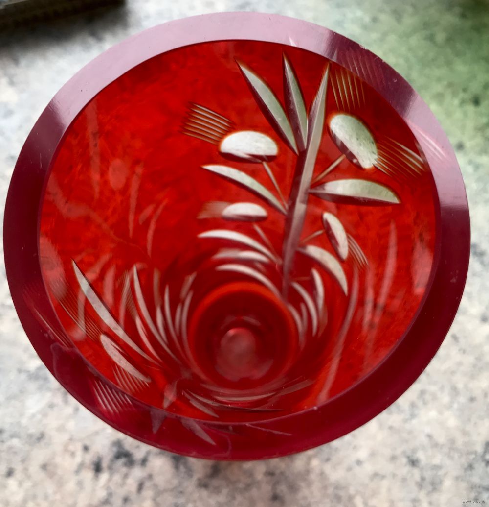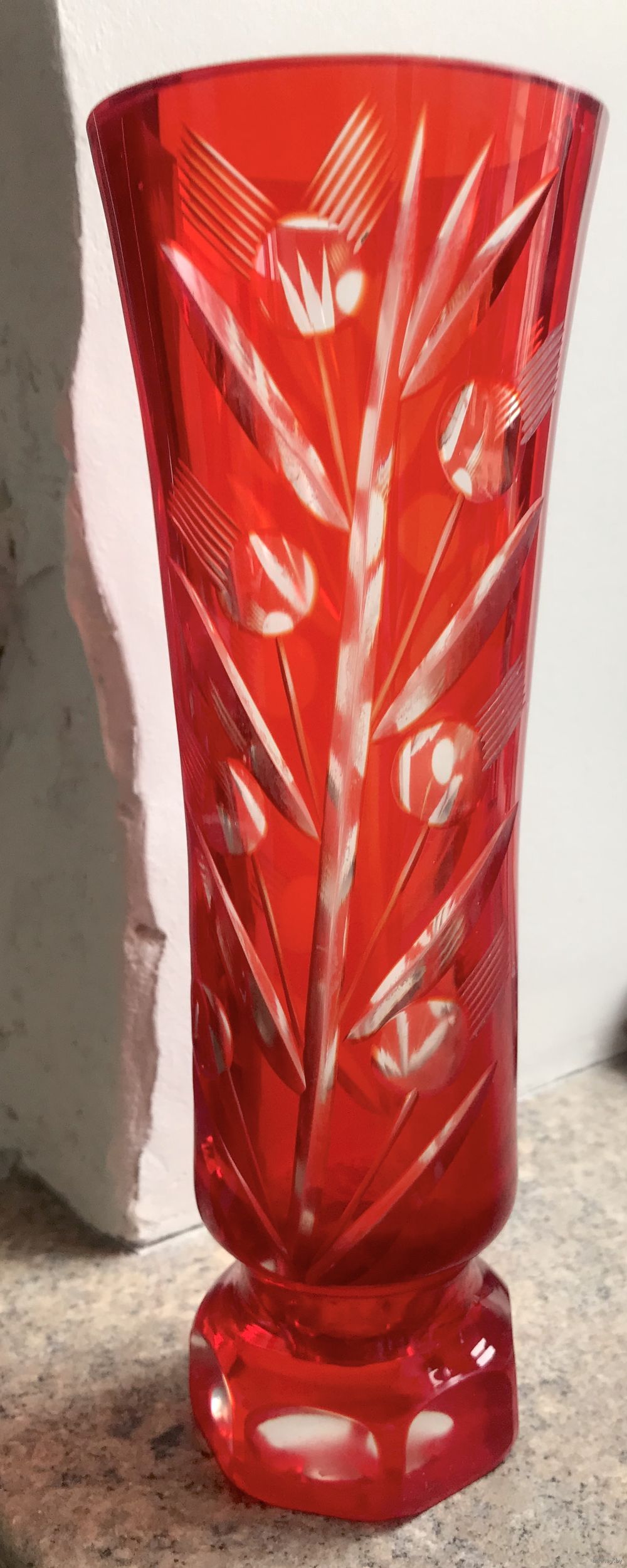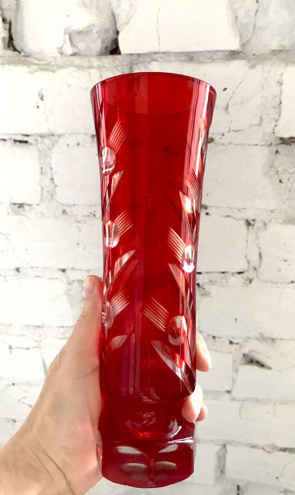 Ваза из красного стекла. Высота 23,5см., диаметр отверстия 7,5см. Состояние хорошее. Тяжёленькая.