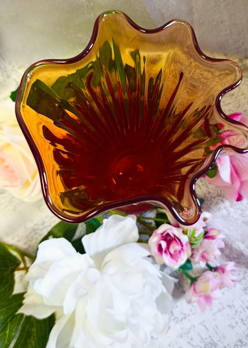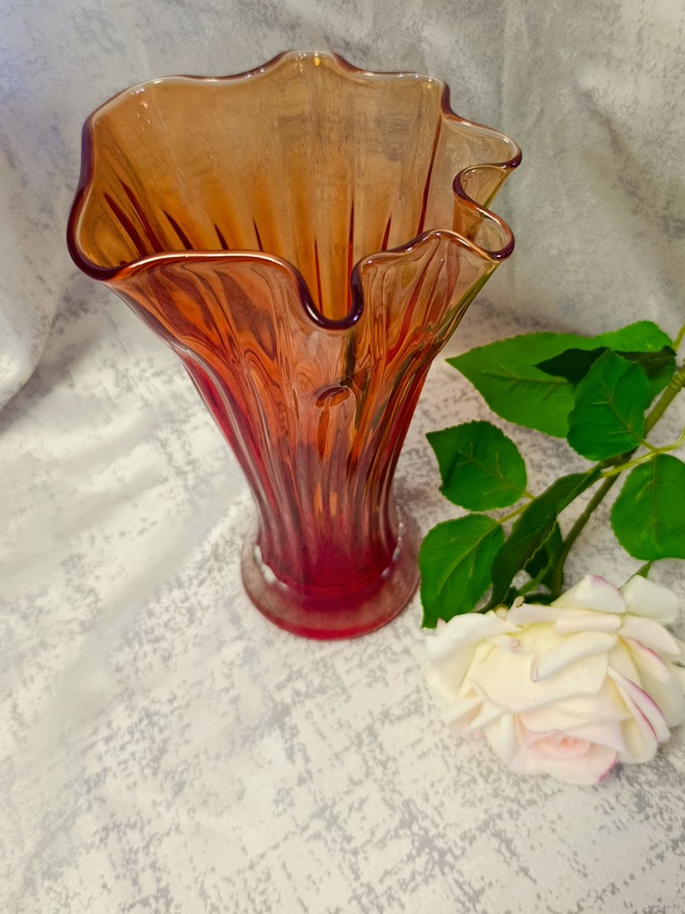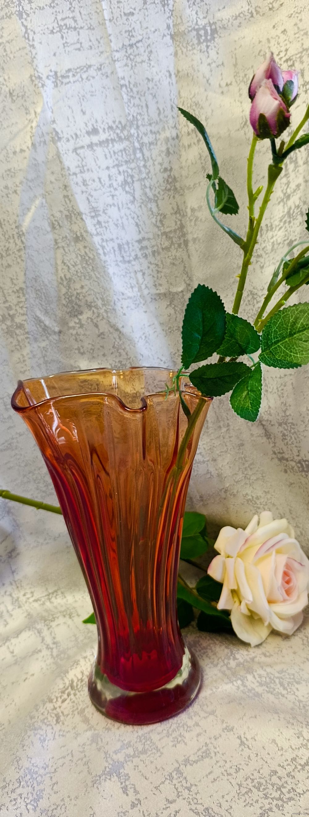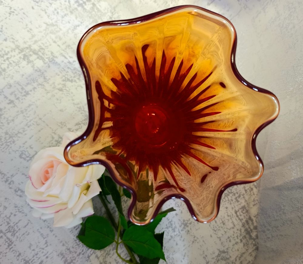 Изысканная ваза Богемия 60-70 г. Гутная техника.Целая.Высота 24.5.Градиентный переход от насыщено красного к янтарному. Акцентный предмет для любого интерьера.Высылаю почтой, европочтой.Упаковка надёжная.