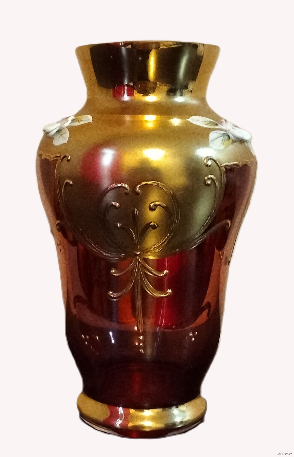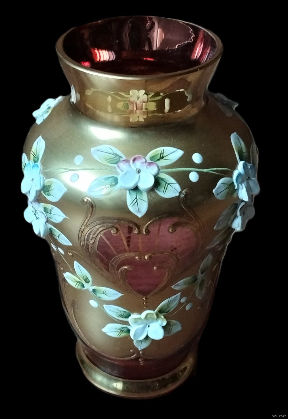 | Ваза из богемского (чешского) стекла, украшенная золочением и эмалевыми цветами. Высота 16 см. | |