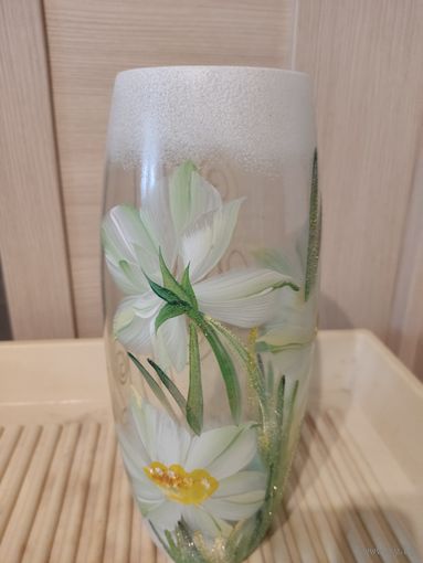 Ваза прктически не была б/у, но от долгого стояния под дном немного по краям обтёрлась наклейка (края как раз приходятся на места соприкосновения с поверхностью, на которой ваза стоит, потому и терлись). Ручная роспись, напыление под золото. Ваза в своей первоначальной картонной упаковке. Высота 26 см.