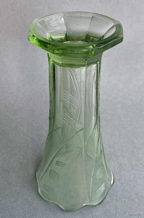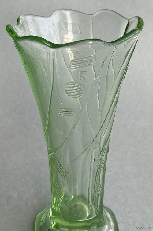 Ваза граненая с рельефным бортом, цветное стекло, гравировка, СССР, 1950-1960 гг. Высота 20,5 см, диаметр горлышка 10,5 см.