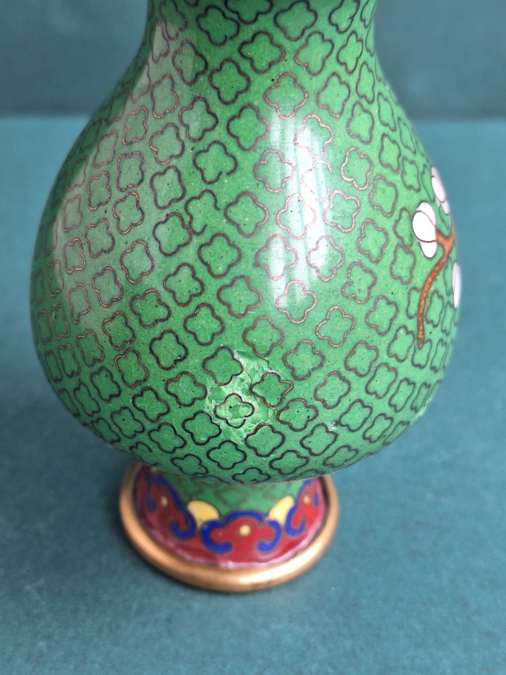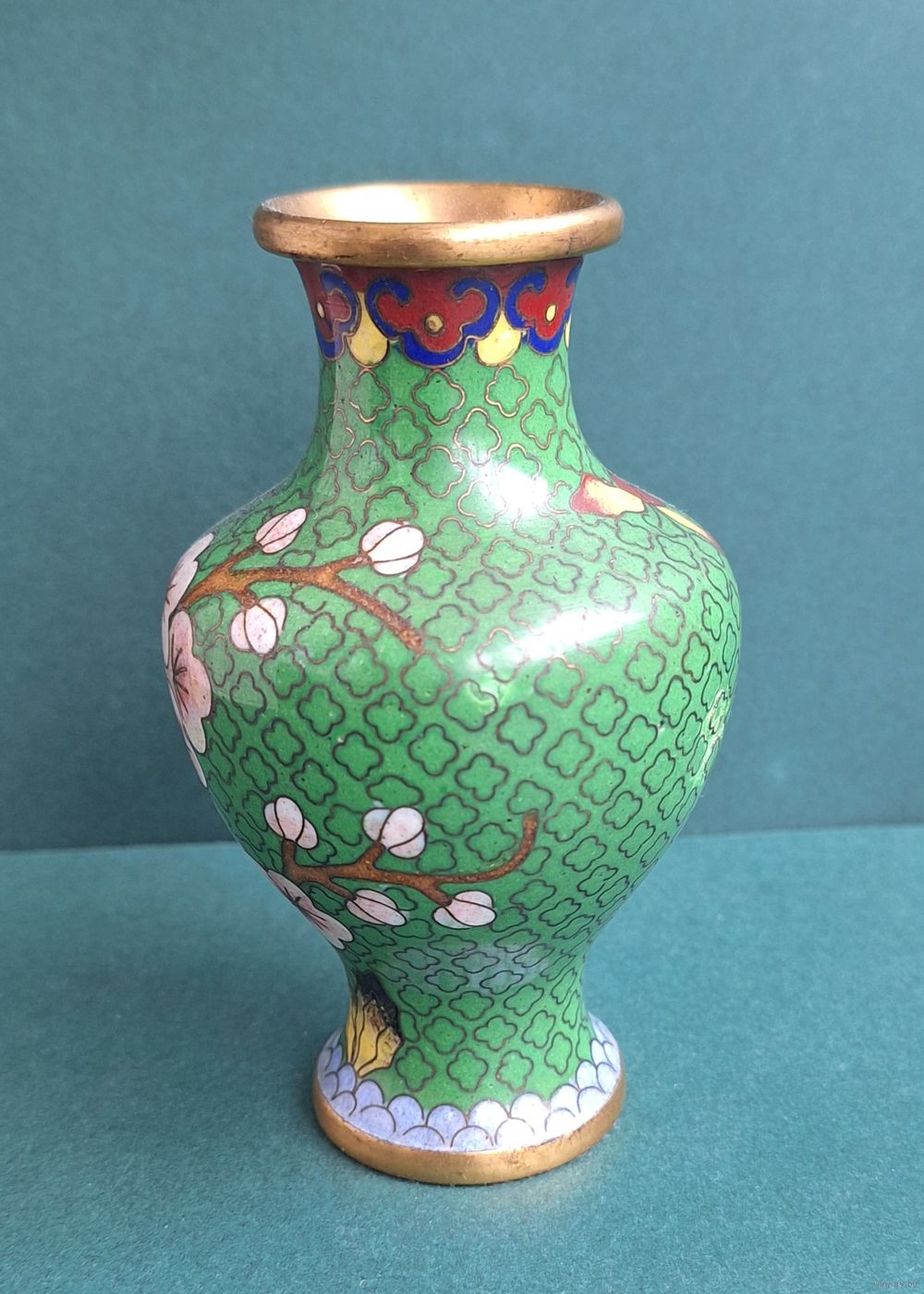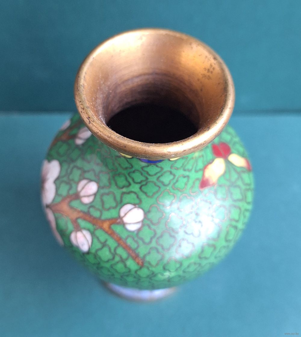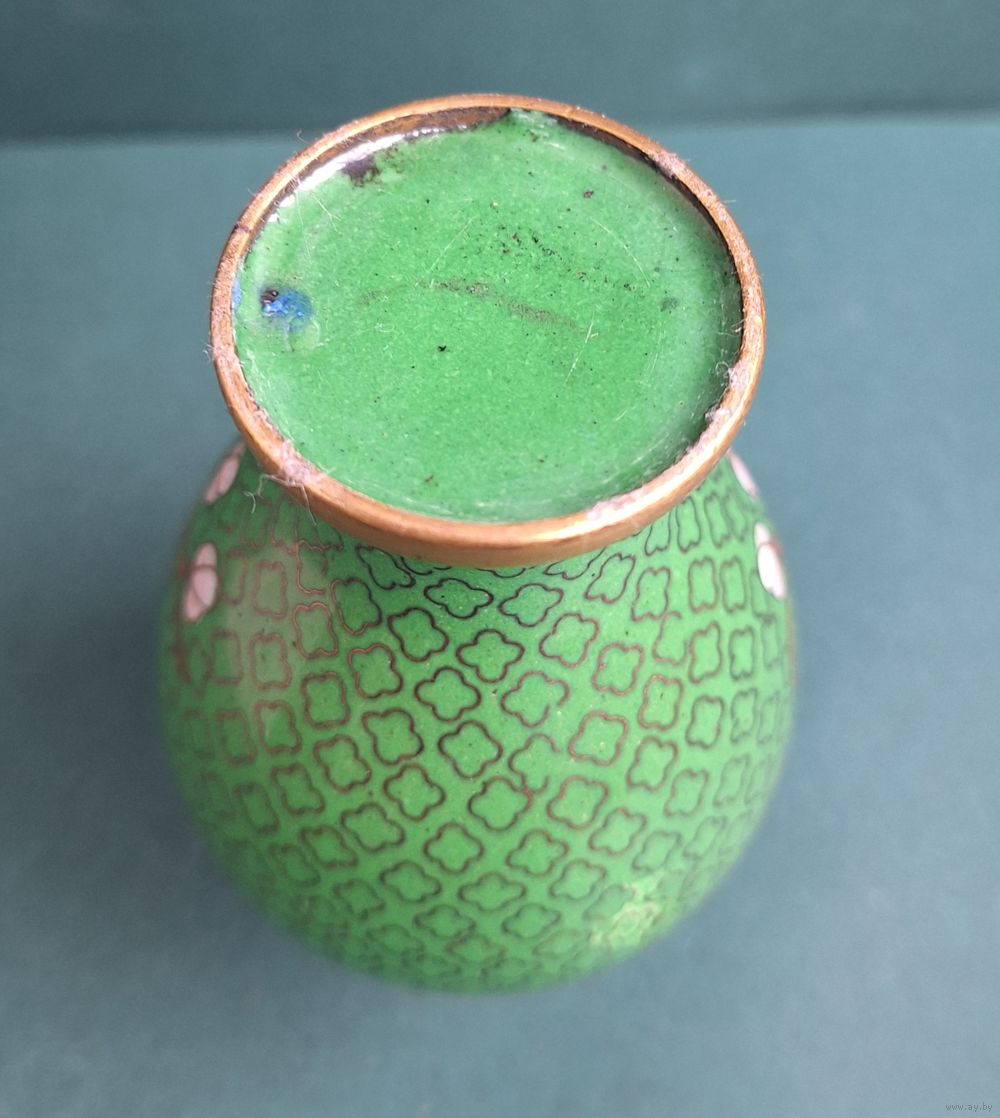 Ваза клуазоне, Китай, 70-е годы, высота 10 см. Есть маленькие сколы эмали, см. последнее фото, и третье. Вмятин - нет.