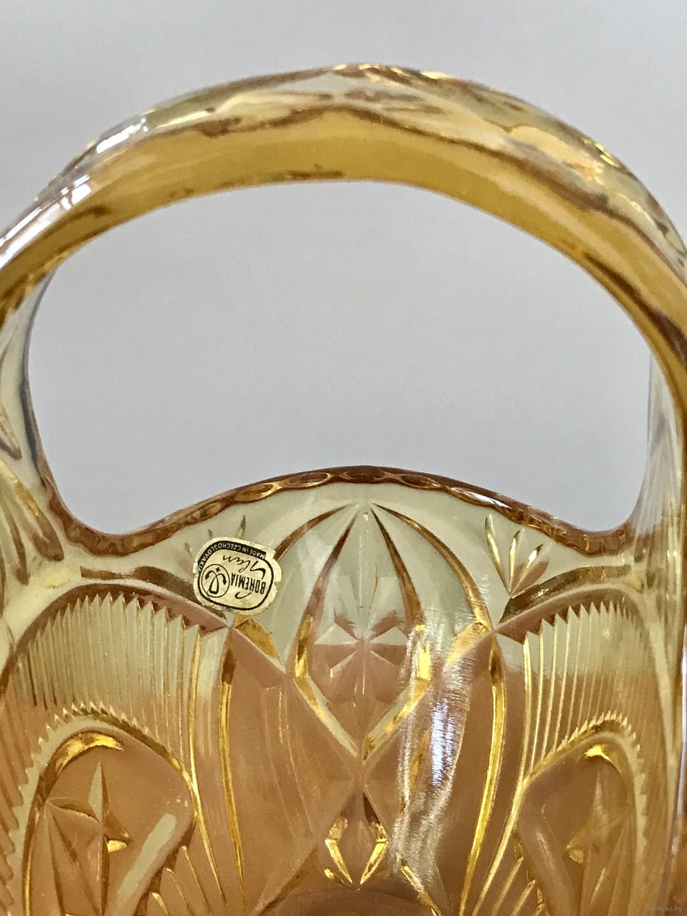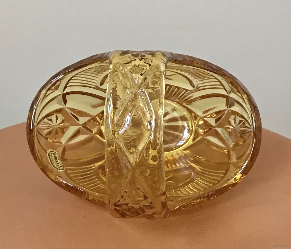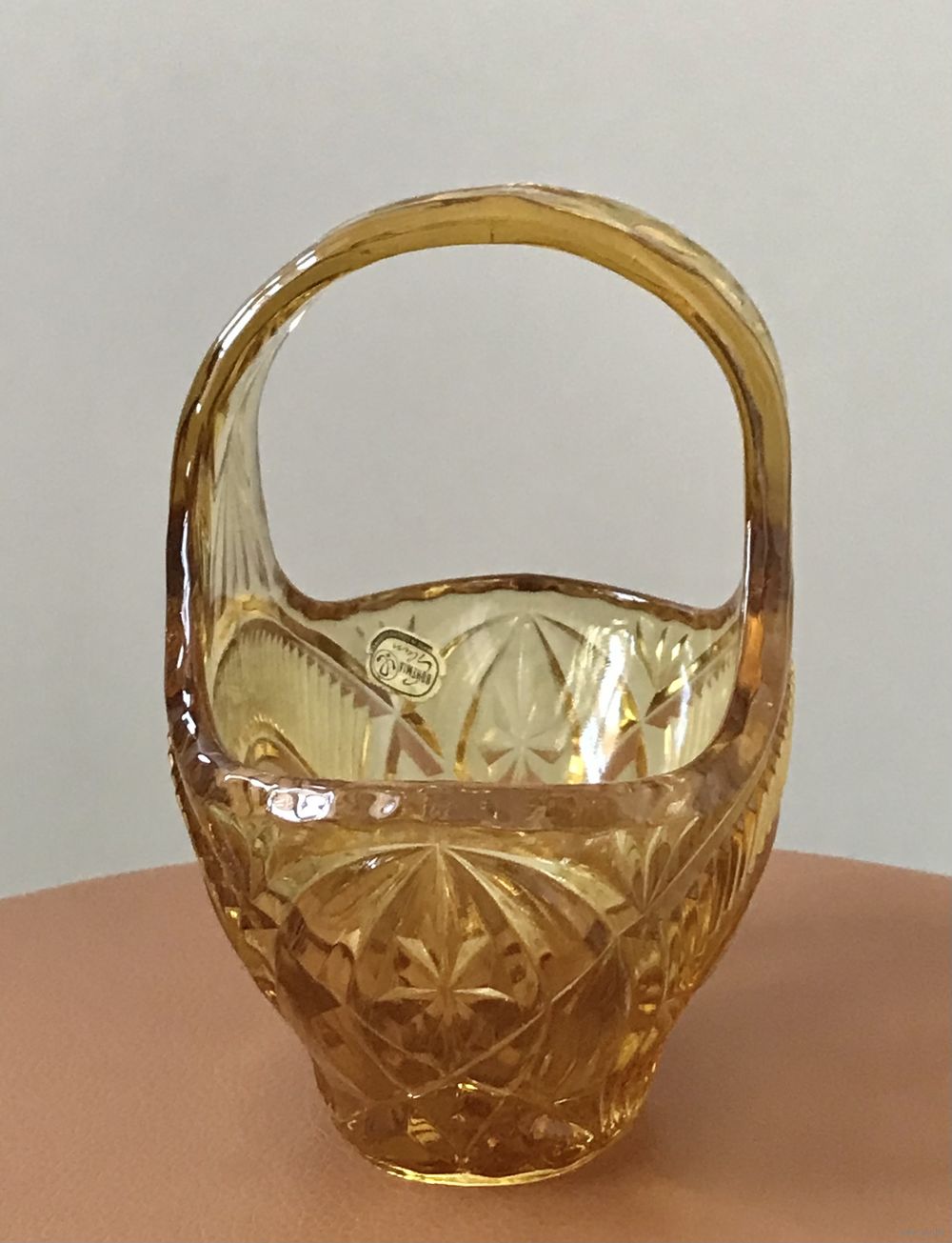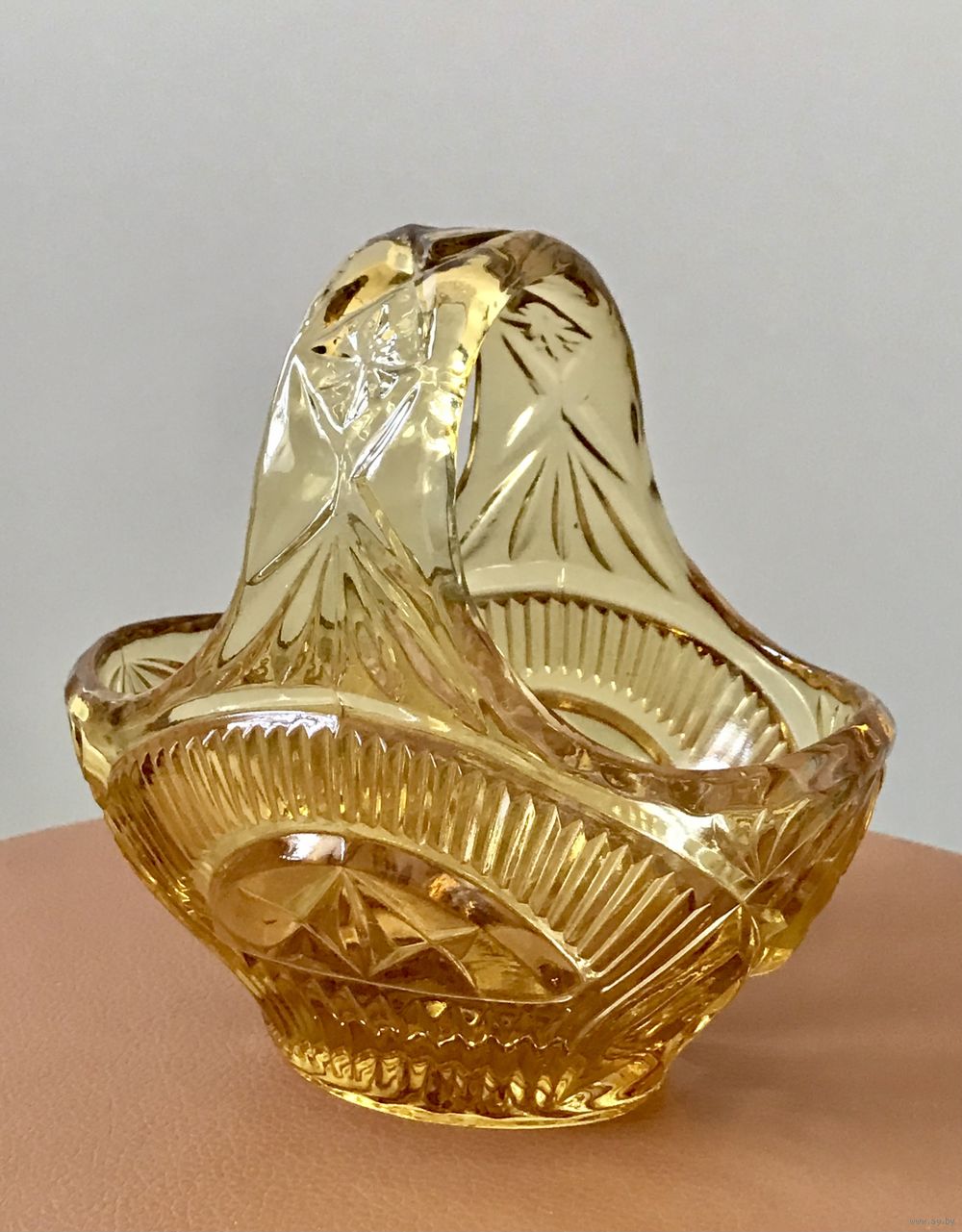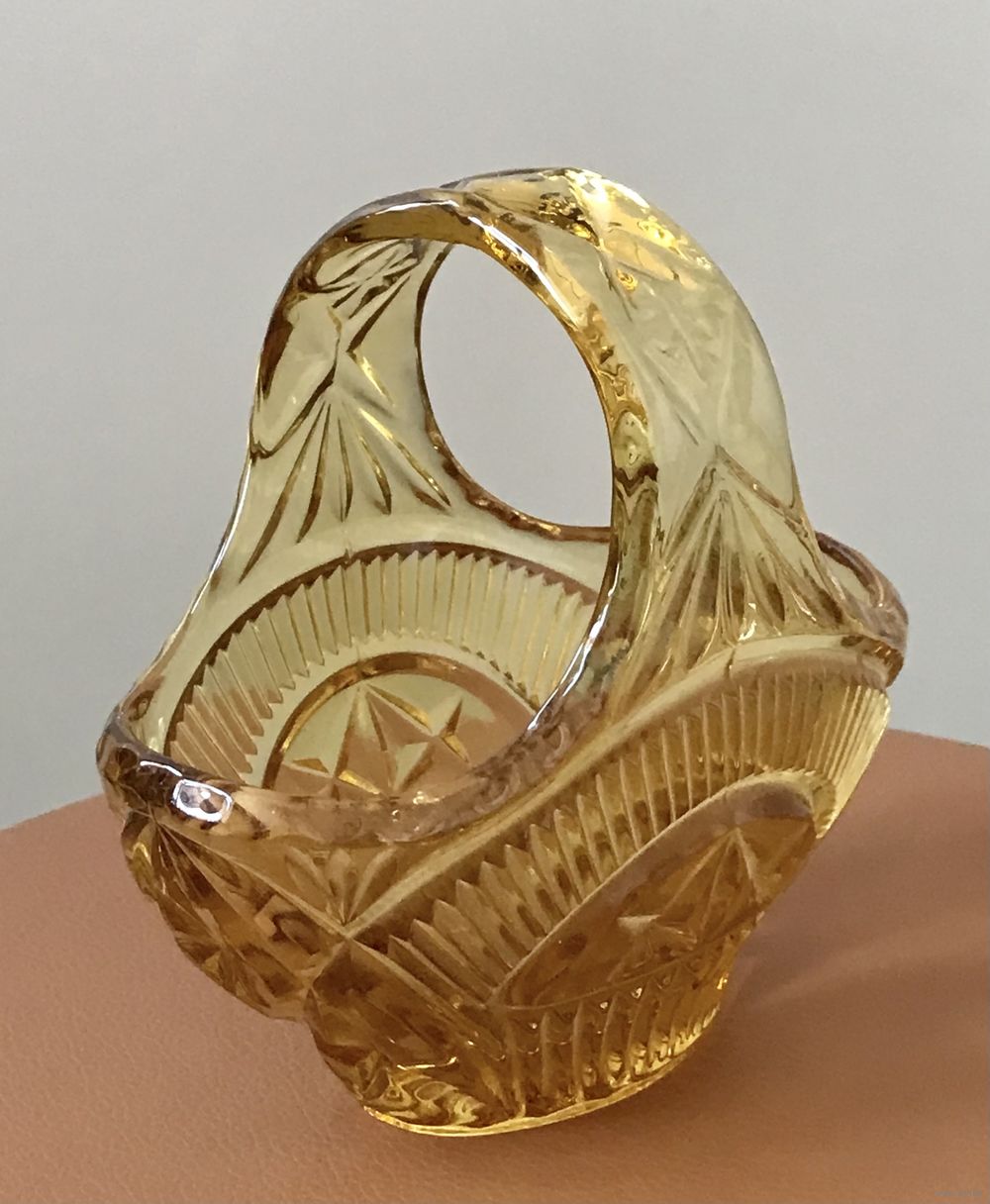 Винтажная вазочка (конфетница) в форме корзинки из стекла медового цвета. Чехословакия Богемия. Высота с ручкой 15см., длина 15см., ширина 9см., глубина 8,5см. Состояние хорошее.