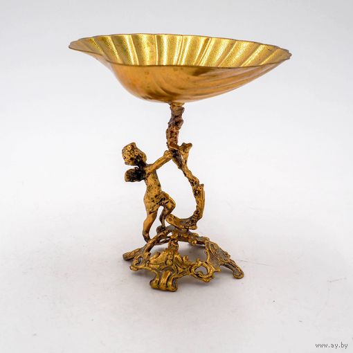 Винтажная ваза-конфетница с золочением, на изящной на ножке с фигуркой Путти. Италия. Чаша имеет форму ракушки. Высота 14 см, ширина 13 см.