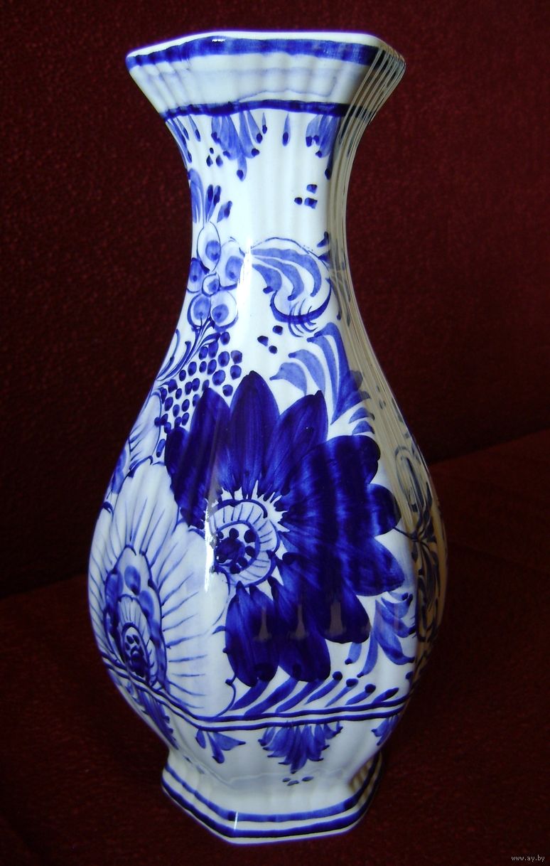 Ваза рельефная Фарфор. Роспись. Размеры: высота--25 см. окружность--38 см. диаметр основания и горловой части--8.5 см..Зап.Европа. Надпись-Ручная работа
