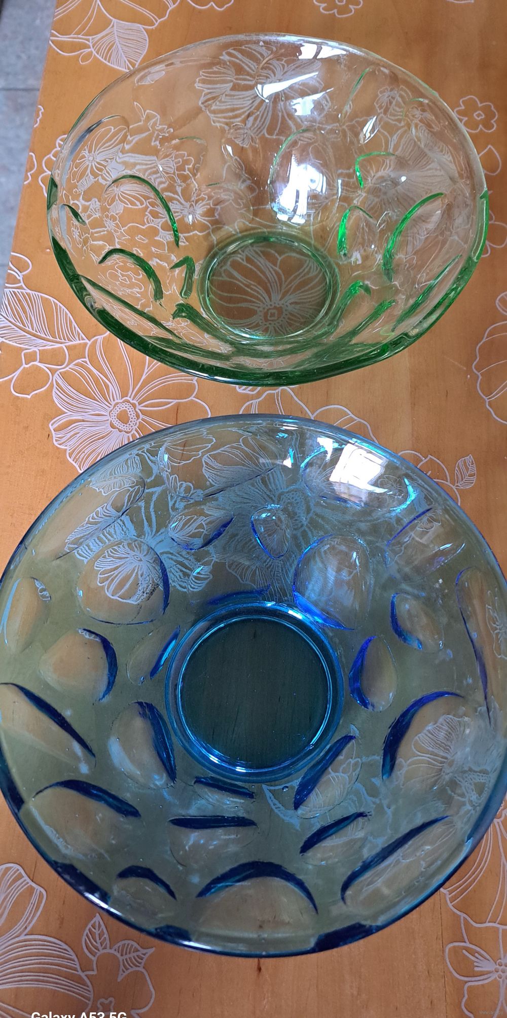 Редкий вид вазы, клейма в массе Неман 50-60г. Послевоенные. Интересны своим "небрежным", неидеальным исполнением. Форма у этих ваз немного отличается, купоросная уже и выше. Салатовая ниже и шире. В купоросной больше пузырей и присутствует свиль, участок с чёрными включениями в толще стекла.