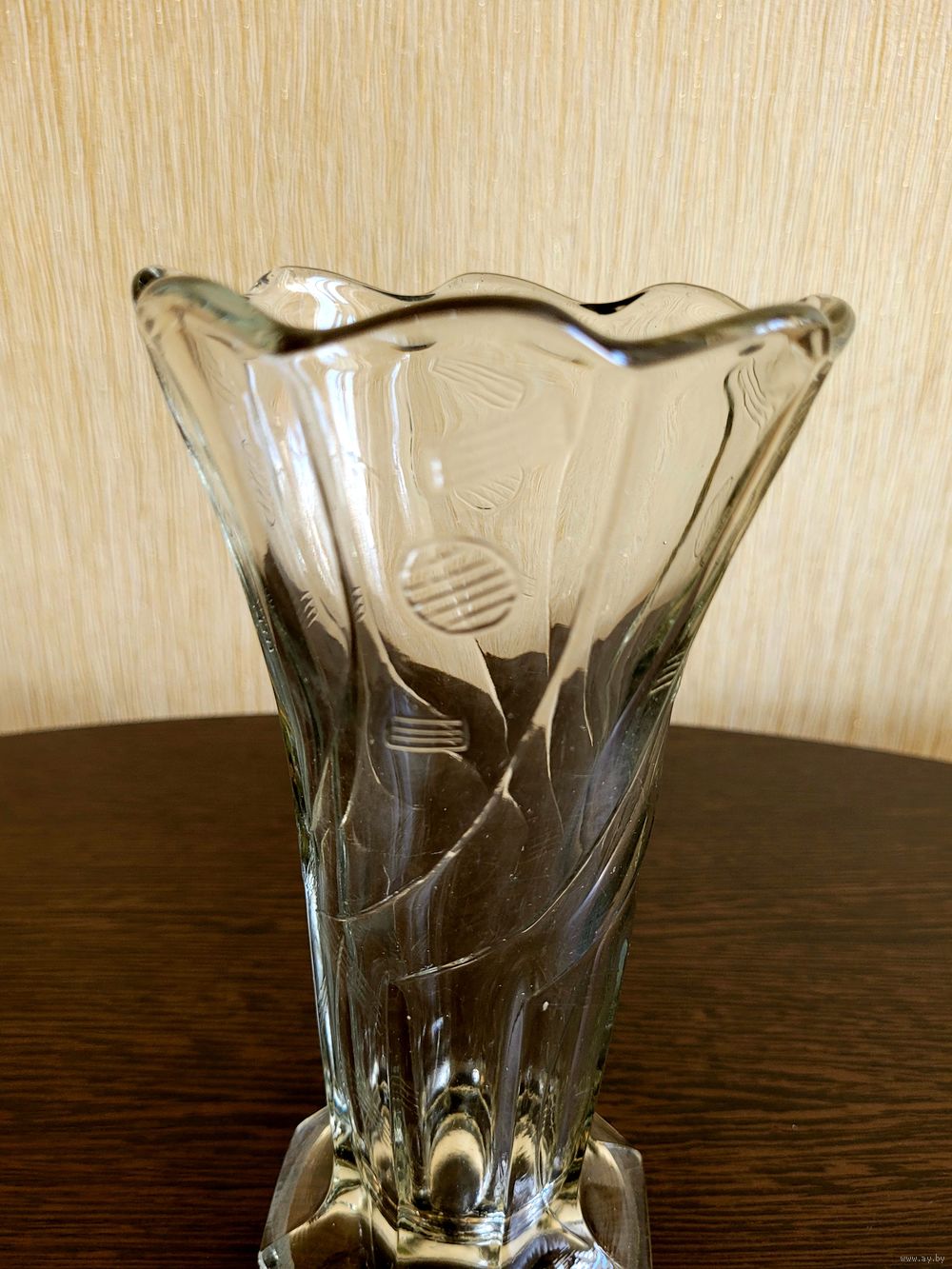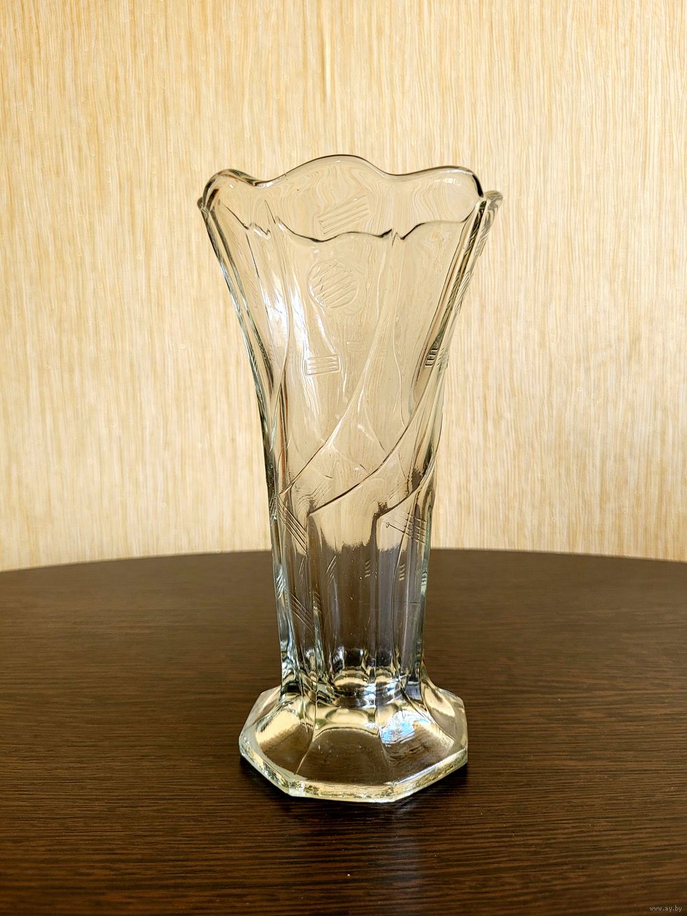 Ваза из бесцветного стекла в стиле ар-деко, высота 20 см, диаметр раскрытия 10,5 см. Старый Неман, модель в каталоге/прейскуранте J. Stolle за номером 1816.