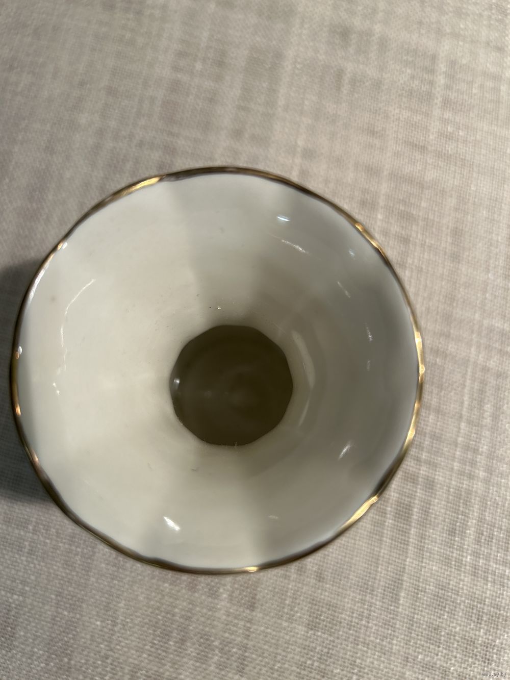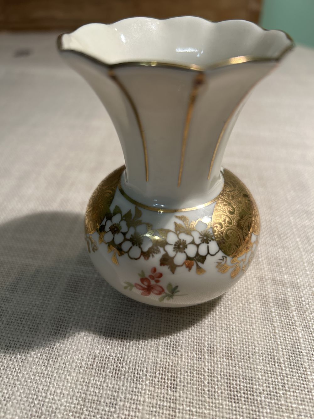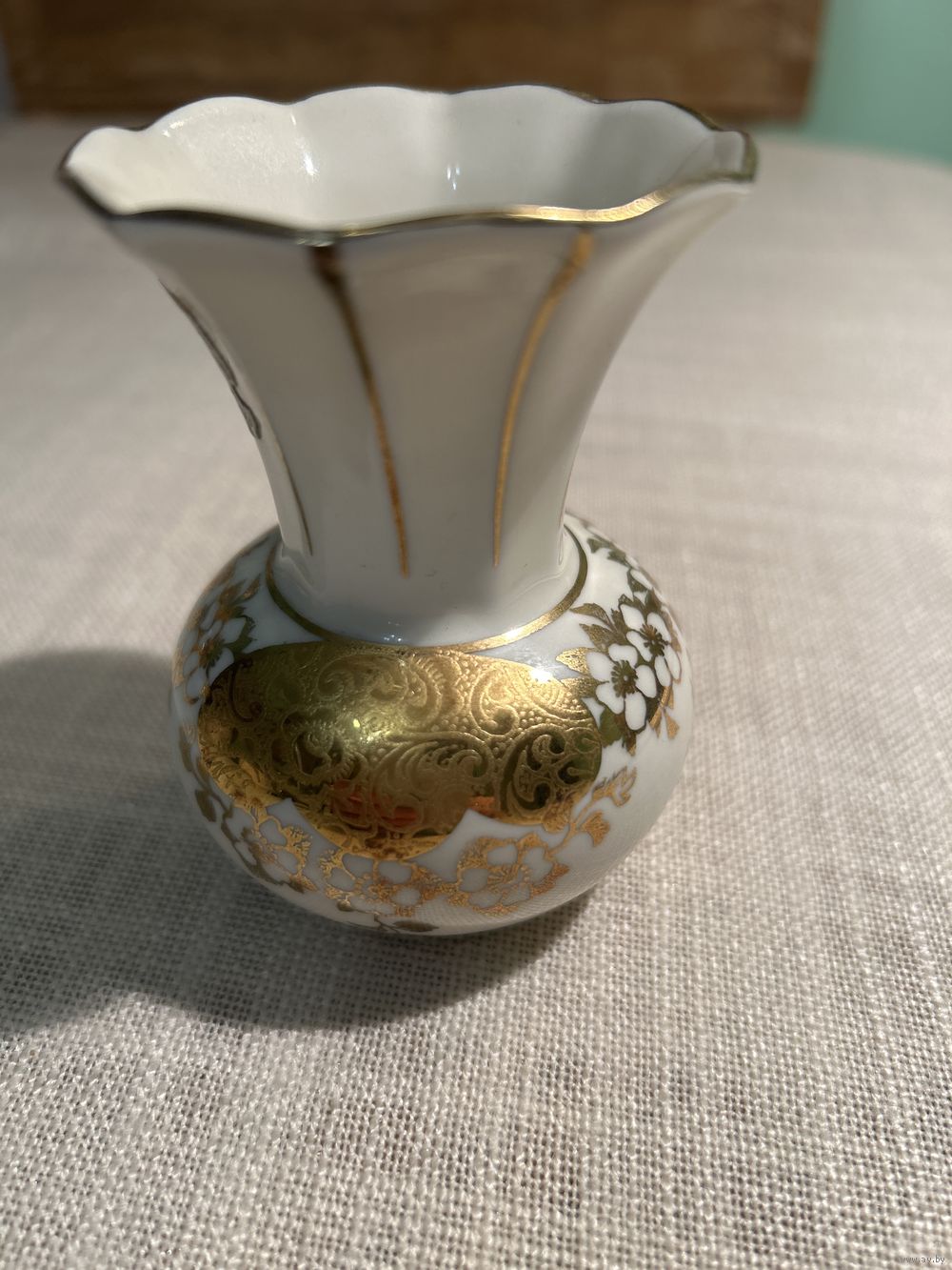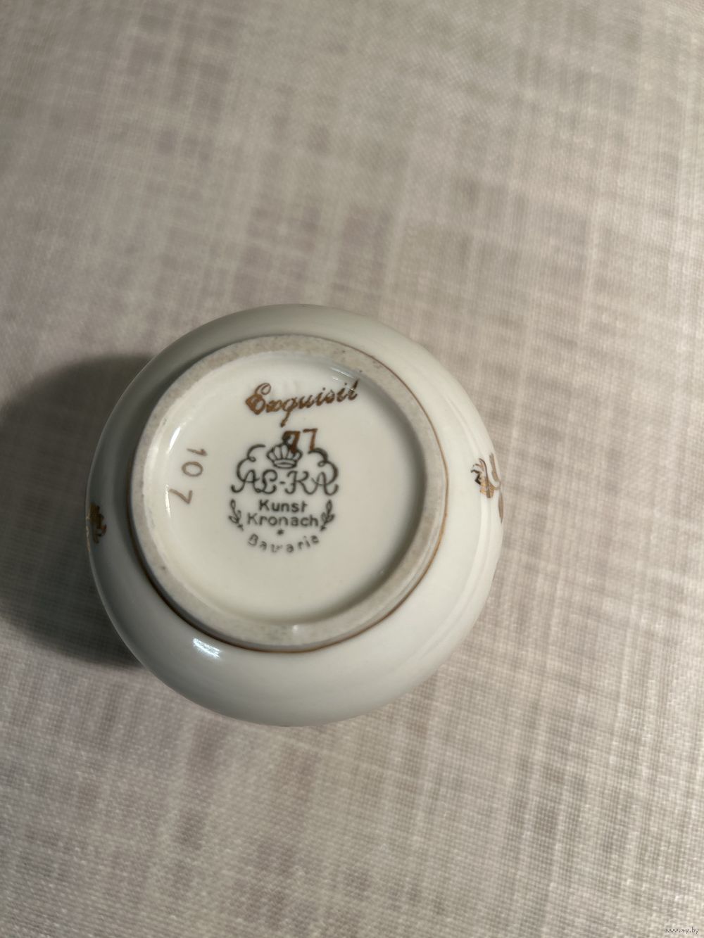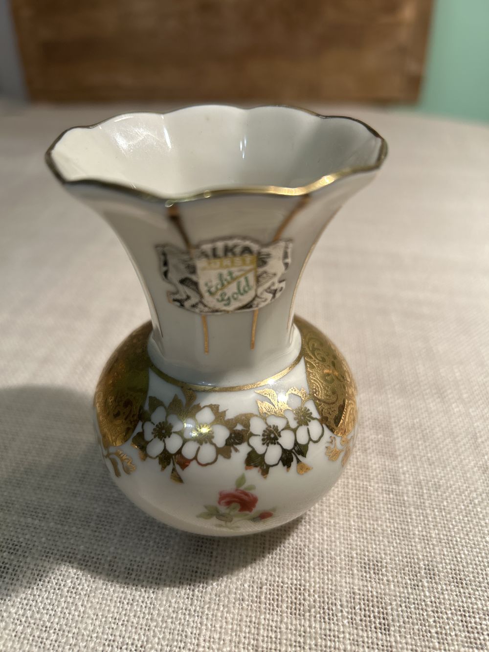 Это миниатюрная фарфоровая вазочка с надписью “Echt Gold “(настоящее золото) на этикетке от Аlka Kunst (Alboth& Kaiser),Bavaria ,украшенная цветочным узором и золотой отделкой .8 см высота ,диаметр 5.5 см