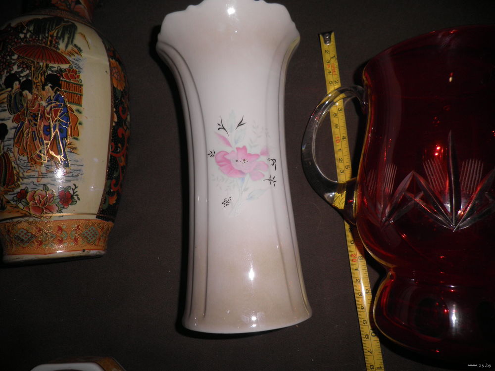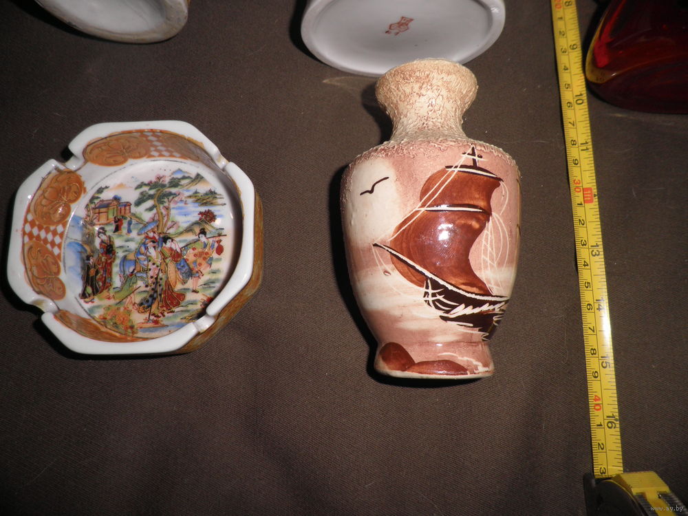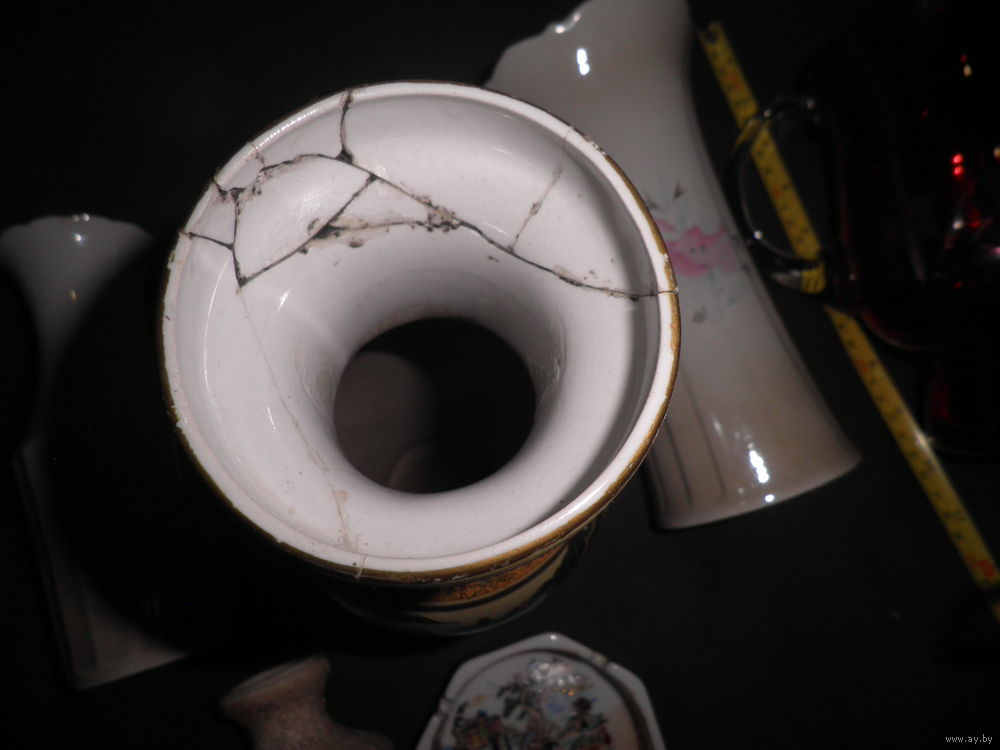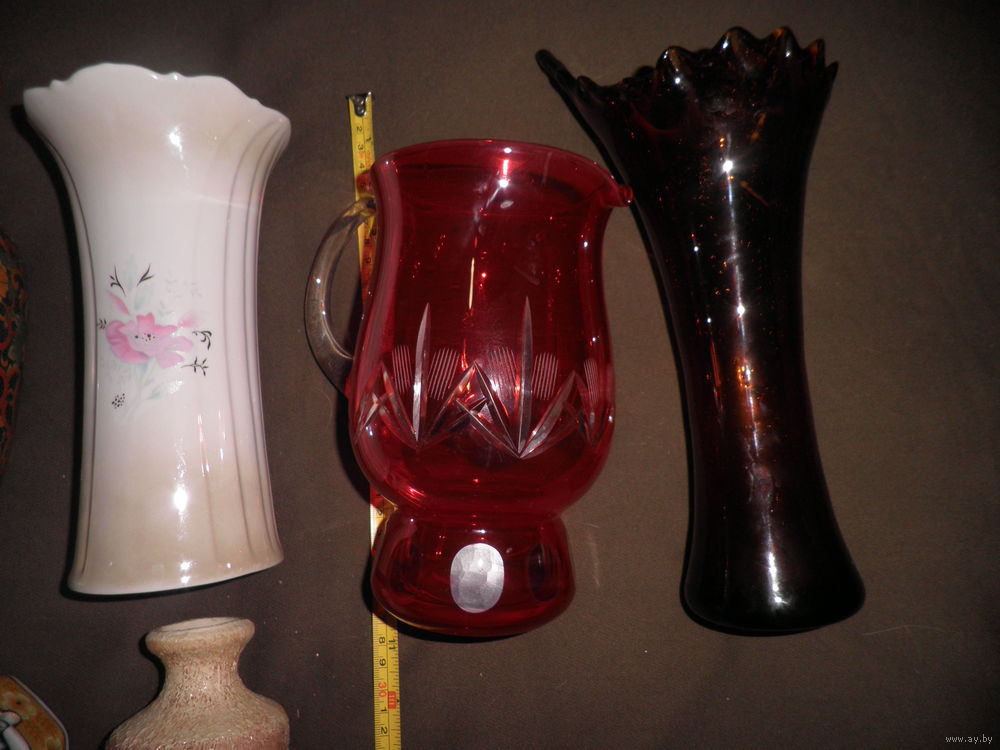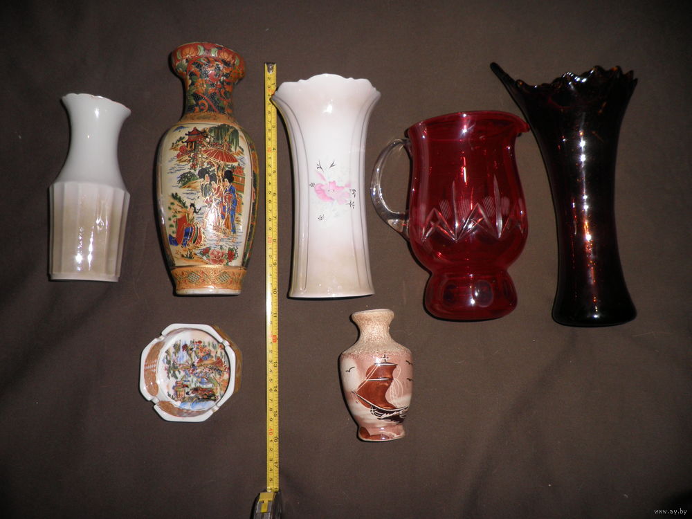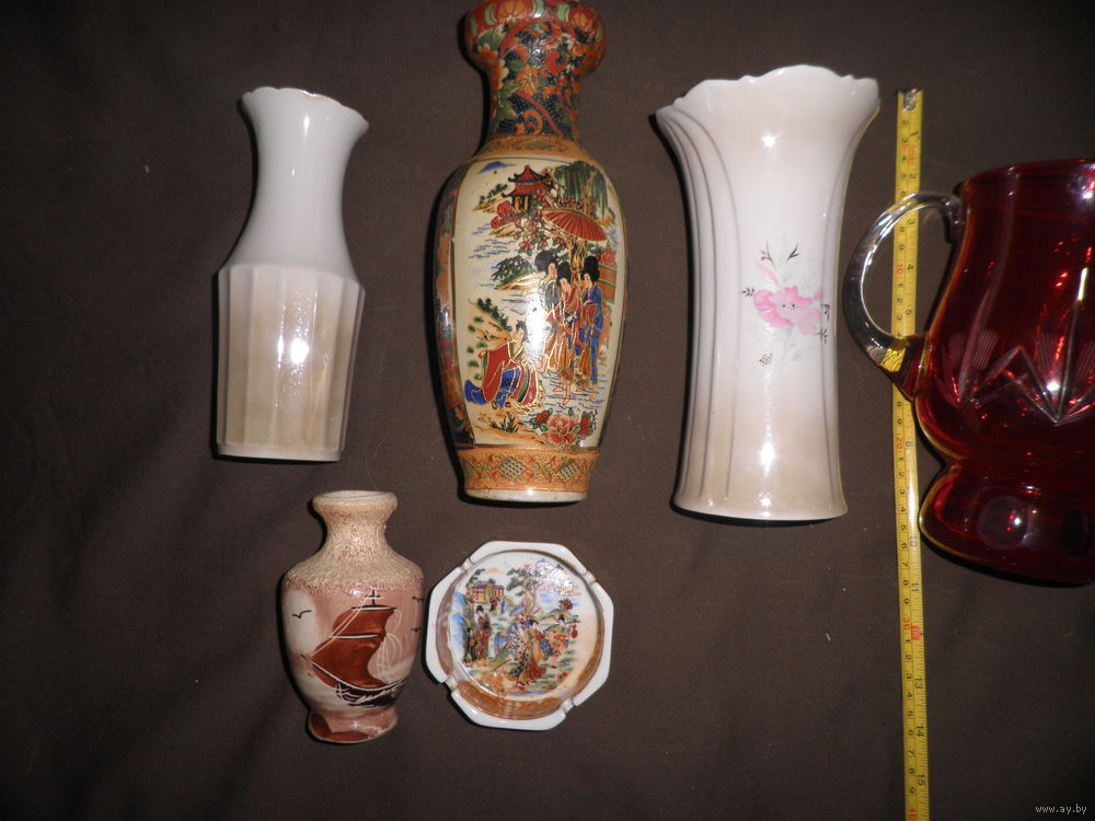 Состояние на фото,трещина красного кувшина,но воду держит,трещина расписной вазы(фото),скольчик вазы(фото 8).остальные целые,ручная роспись.