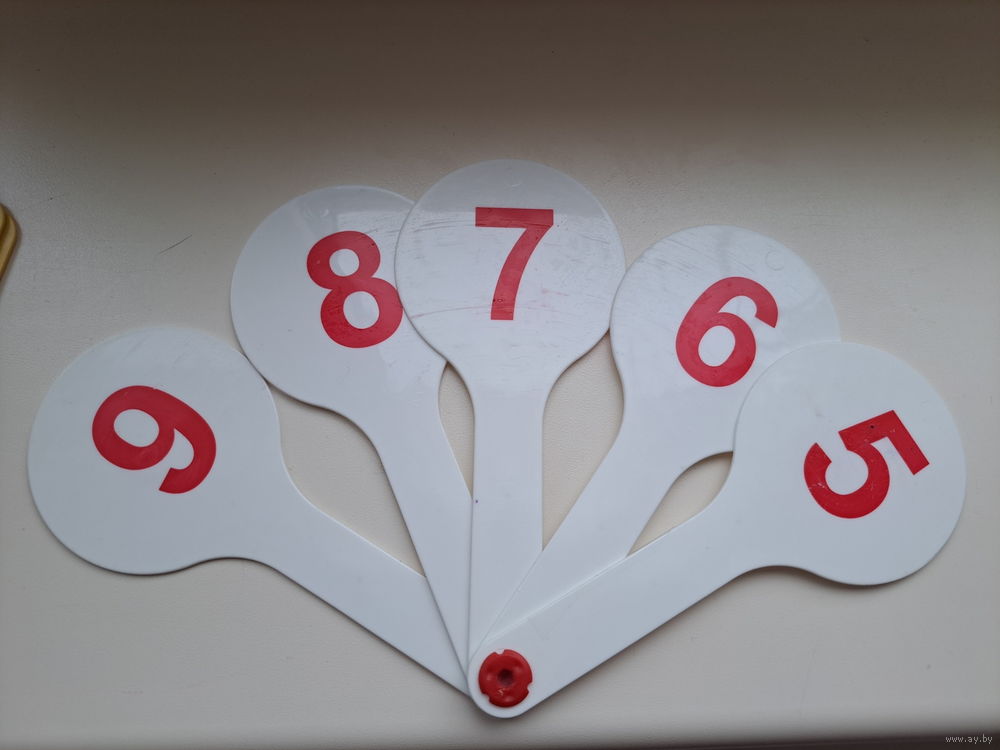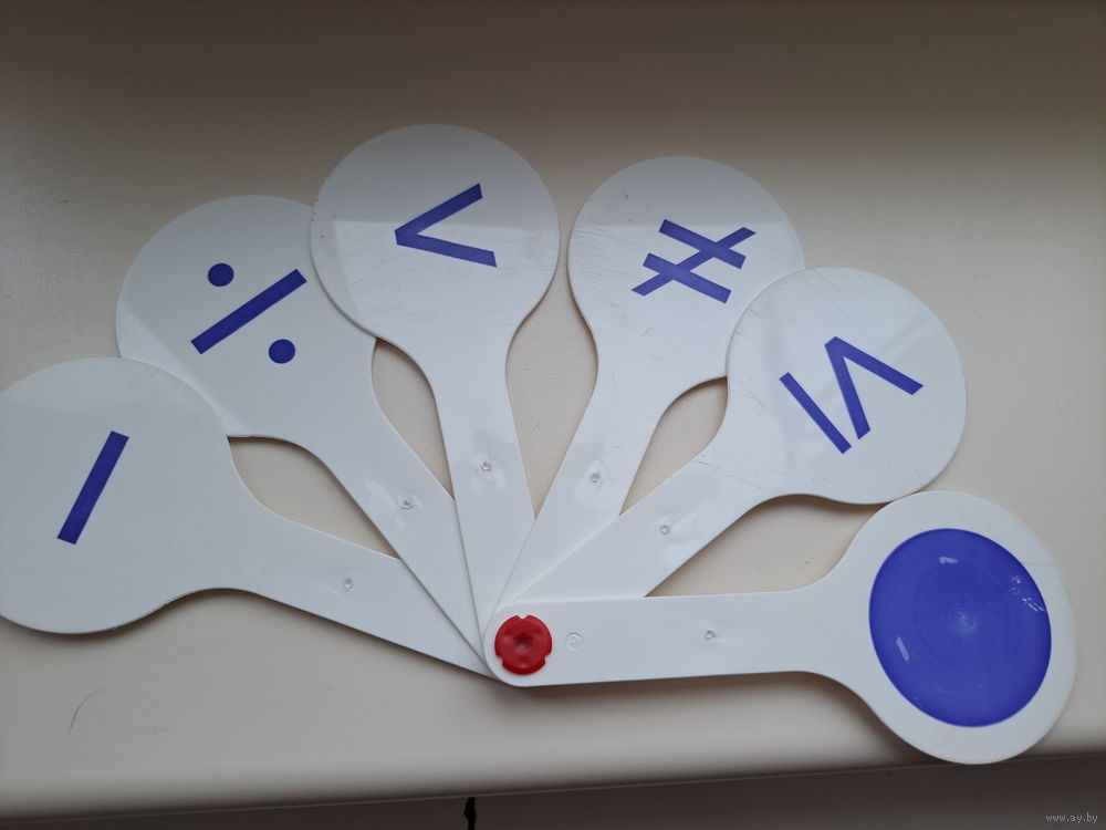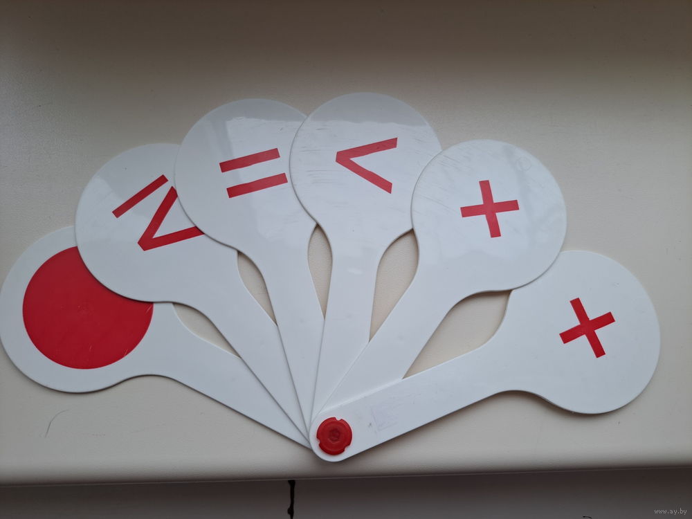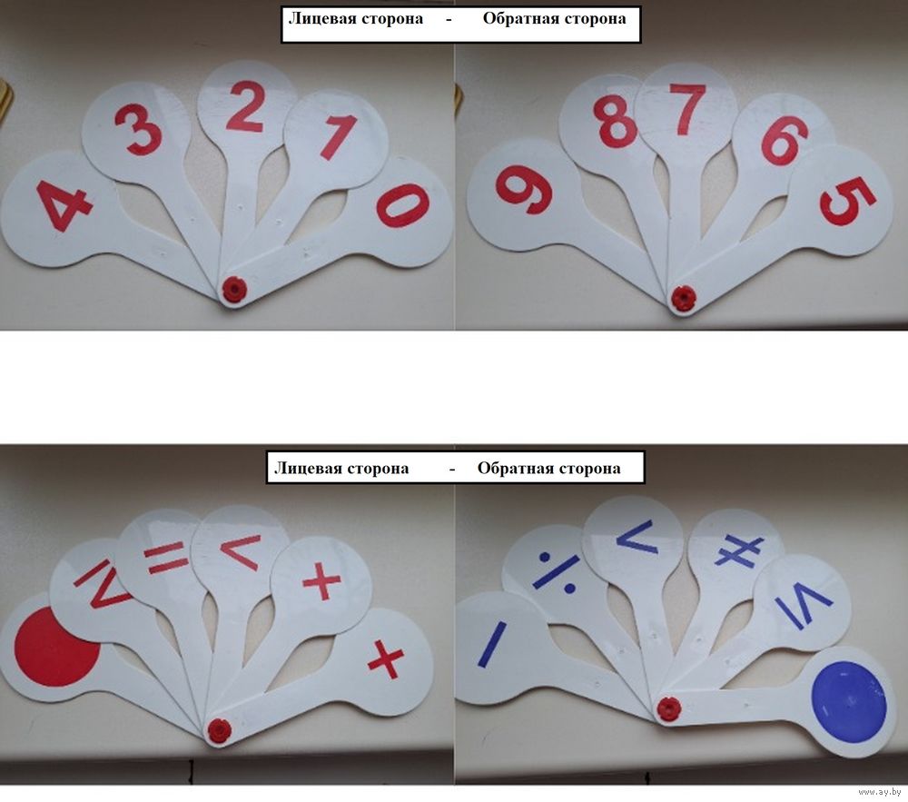 Веера цифр от 1-10 и знаков математических, двухсторонние, пластиковые, б.у в хорошем состоянии. Цена за 1 веер. Вышлю Белпочтой по предоплате на моб.телефон.
