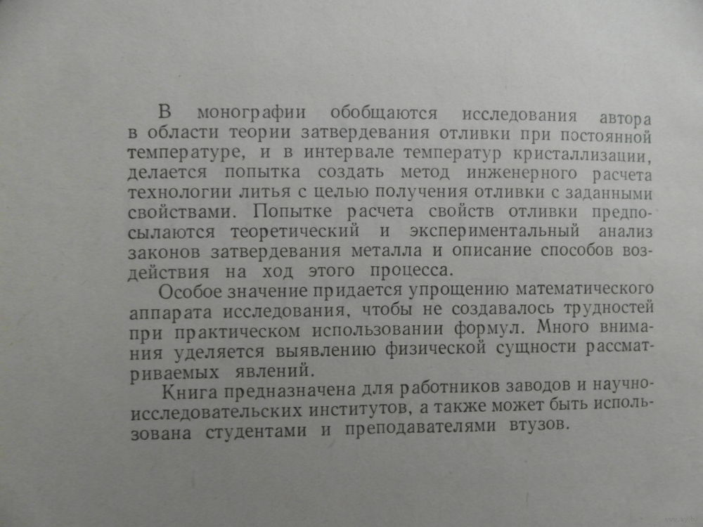 B монографии обобщаются исследования автора в области теории затвердевания отливки при постоянной температуре, и в интервале температур кристаллизации, делается попытка создать метод инженерного расчета технологии литья с целью получения отливки с заданными свойствами. Попытке расчета свойств отливки предпосылаются теоретический и экспериментальный анализ законов затвердевания металла и описание способов воздействия на ход этого процесса. Особое значение придается упрощению математического аппарата исследования, чтобы не создавалось трудностей при практическом использовании формул. Много внимания уделяется выявлению физической сущности рассматриваемых явлений. Книга предназначена для работников заводов и научно исследовательских институтов, а также может быть использована студентами и преподавателями втузов.