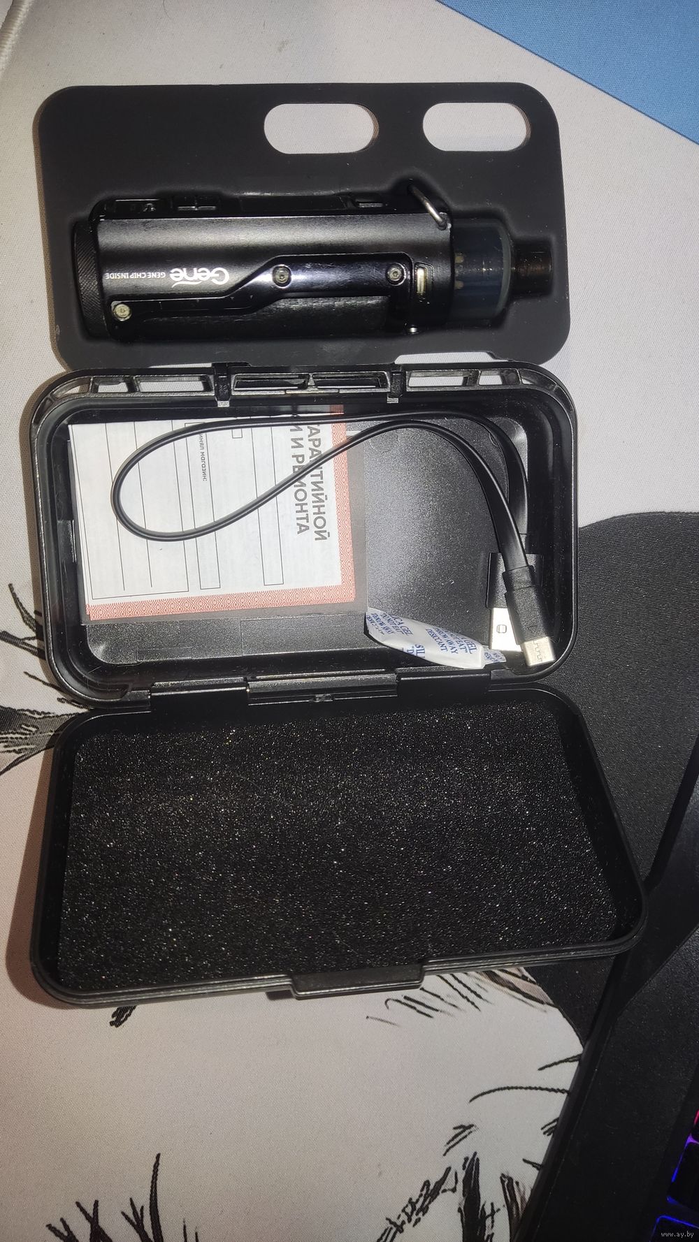 Комплект полный, за исключением защитной резинки на баке - она утерялась. Коробка, провод для зарядки, под, бак. Помимо этого, защитная резинка на порте для зарядки оторвалась в ходе эксплуатации. По работе проблем нет