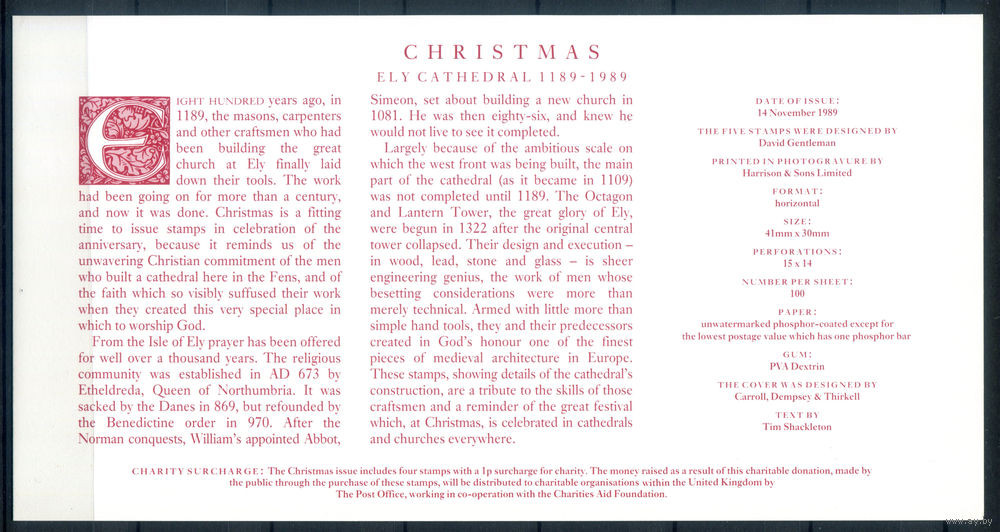 Великобритания - 1989г. - Рождество, кафедральный собор - 1 конверт с гашением первого дня (FDC) и информационным буклетом - полная серия [Mi 1235-1239]. #3-GB-99-CP-23