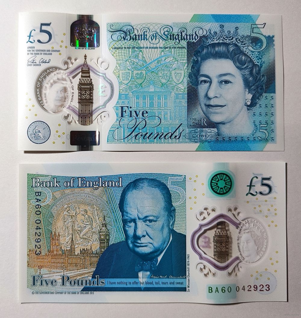 Великобритания, 5 фунтов 2015 г., P-394 (BA, полимер, полимер, Елизавета II и сэр Уинстон Черчилль), UNC