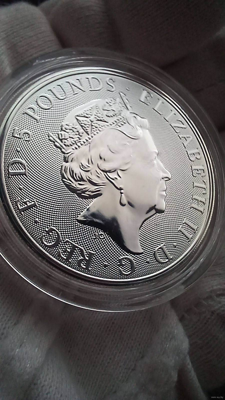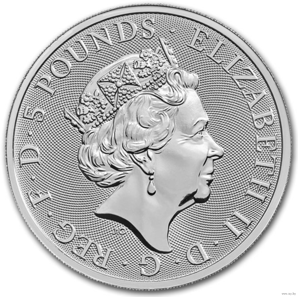 На реверсе монеты изображен разрывающий цепи единорог, вставший на дыбы за щитом с изображением Льва, символа Англии. Вес металла, чистота и год указаны по краям. На аверсе монеты изображена Королева Елизавета II, надпись её имени и номинал в фунтах стерлингов. Это первая монета из серии «Королевские звери» с новым гильошированным дизайном- точечный орнамент образует расходящиеся дуги.