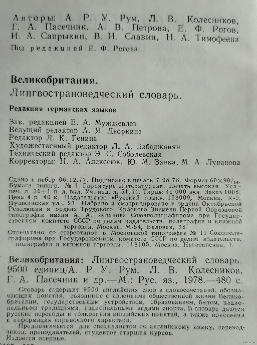 Рум А.Р.У., Колесников Л.В., Пасечник Г.А. и др. Великобритания. Лингвострановедческий словарь. 9 500 единиц. Под. Ред. Е.Ф. Рогова. М.: Русский язык, 1978г., 480 с. Твёрдый переплёт. Обычный формат.