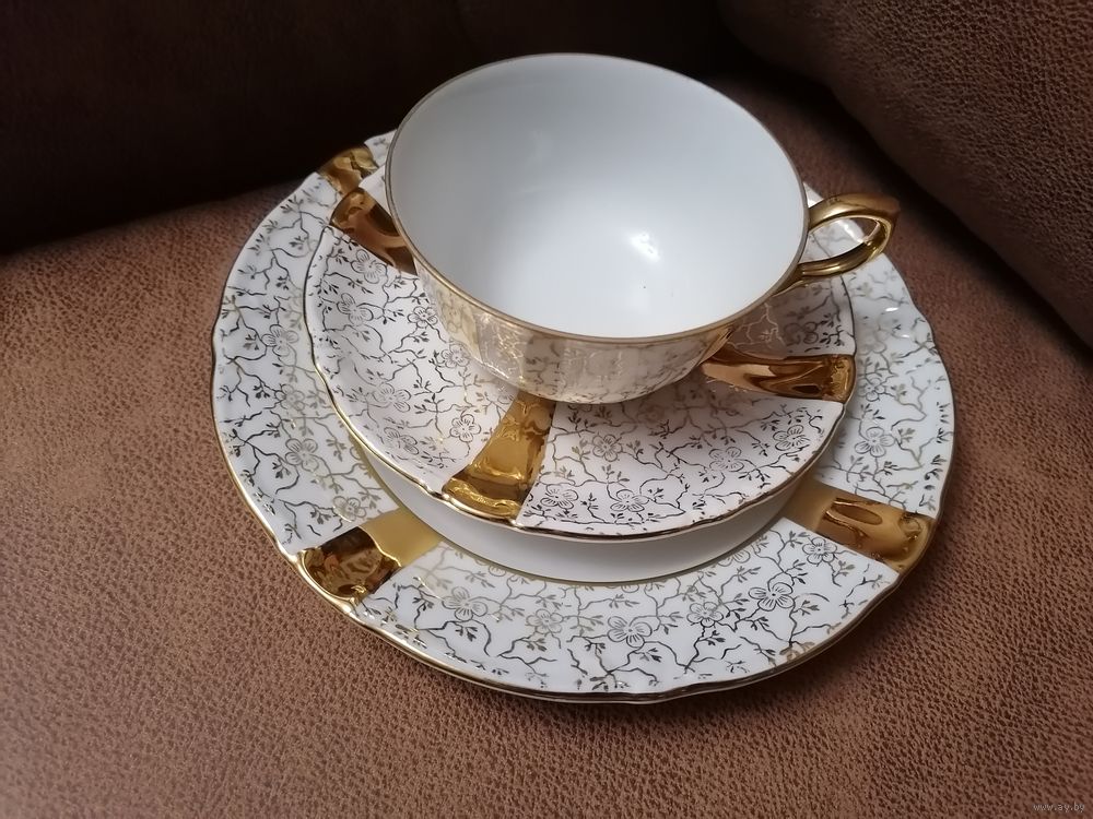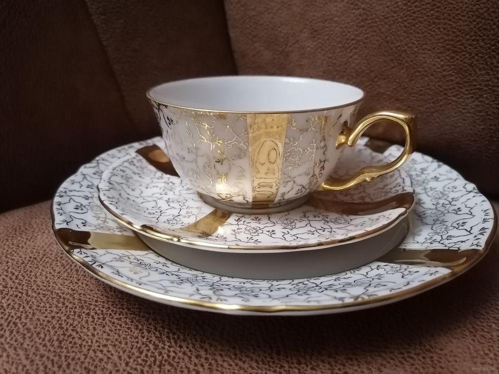 Великолепная чайная тройка из тонкого качественного фарфора с изысканым декором в идеальном состоянии. Объем чашки 220 мл