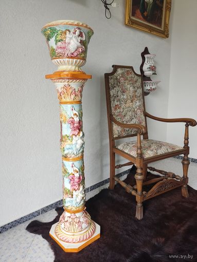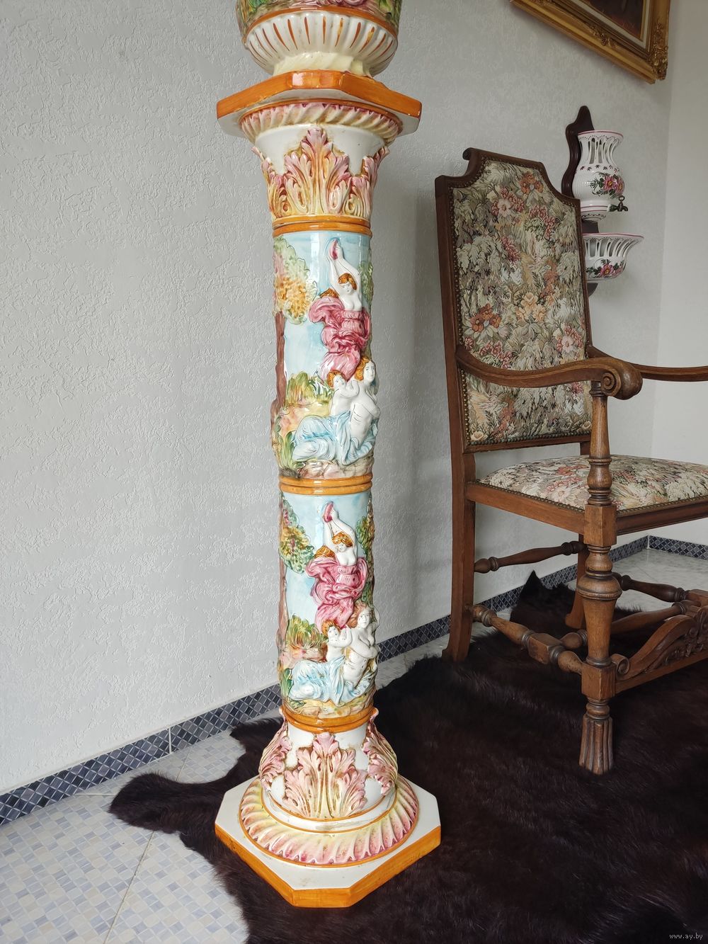 Великолепная Итальянская Колонна с Цветочным Горшком, Постамент с Кашпо / Вазой, Италия 1970-е гг. Майолика, Барельеф, Керамика 1970-е гг