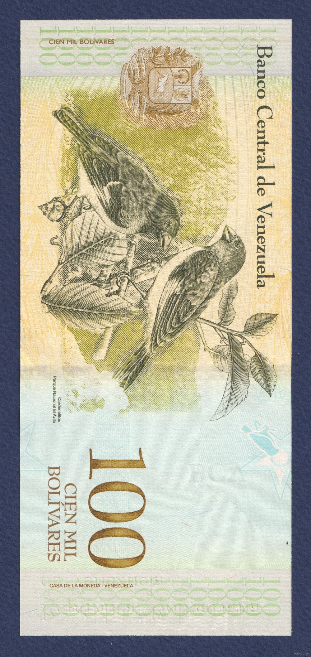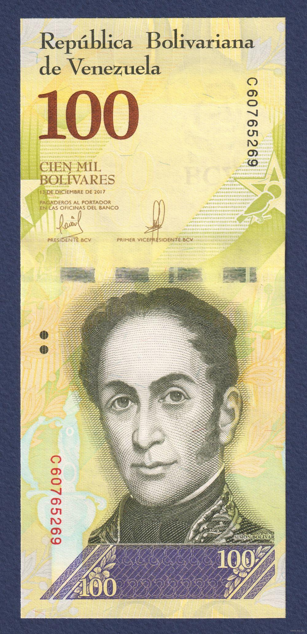 Венесуэла, 100000 боливаров 2017 г., P-100b (C, генерал Симон Боливар, американский чиж), UNC