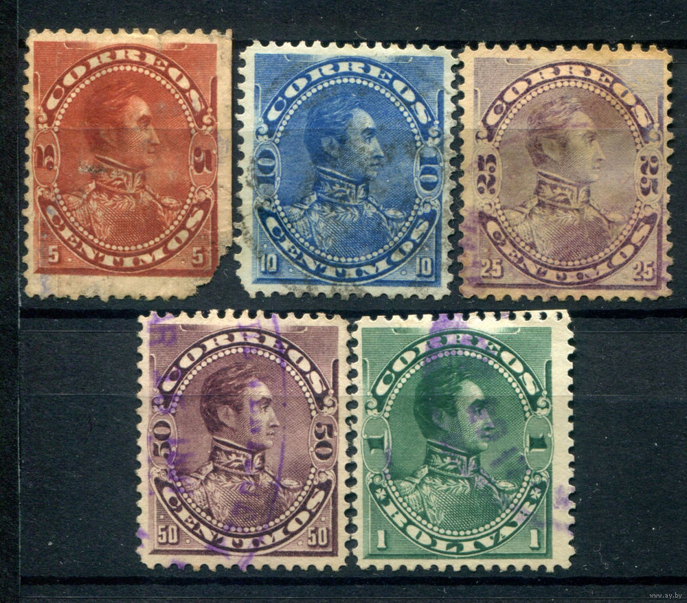 Венесуэла - 1893г. - Симон Боливар - 5 марок - полная серия, гашёные, номинал 5 с повреждением правого нижнего уголка [Mi 42-46]. #4-W1-109-A-2