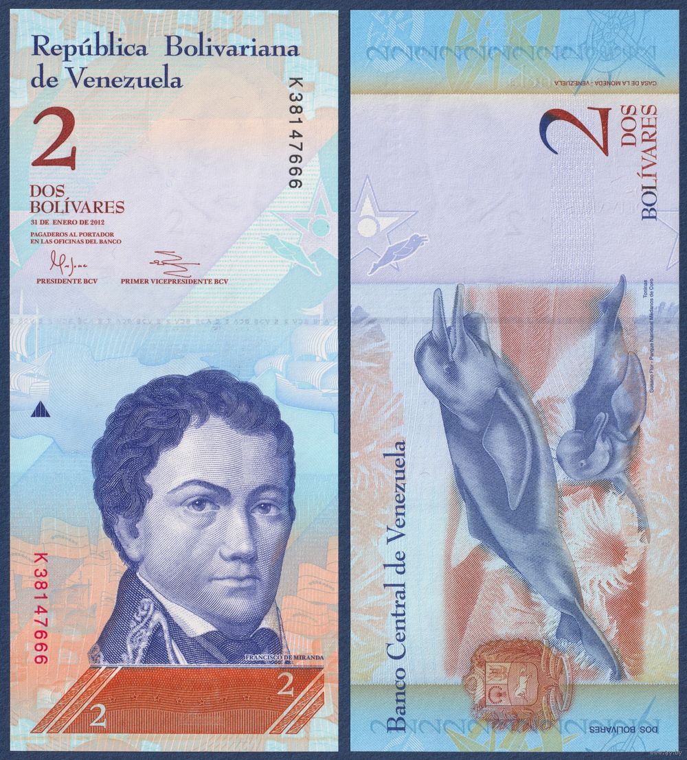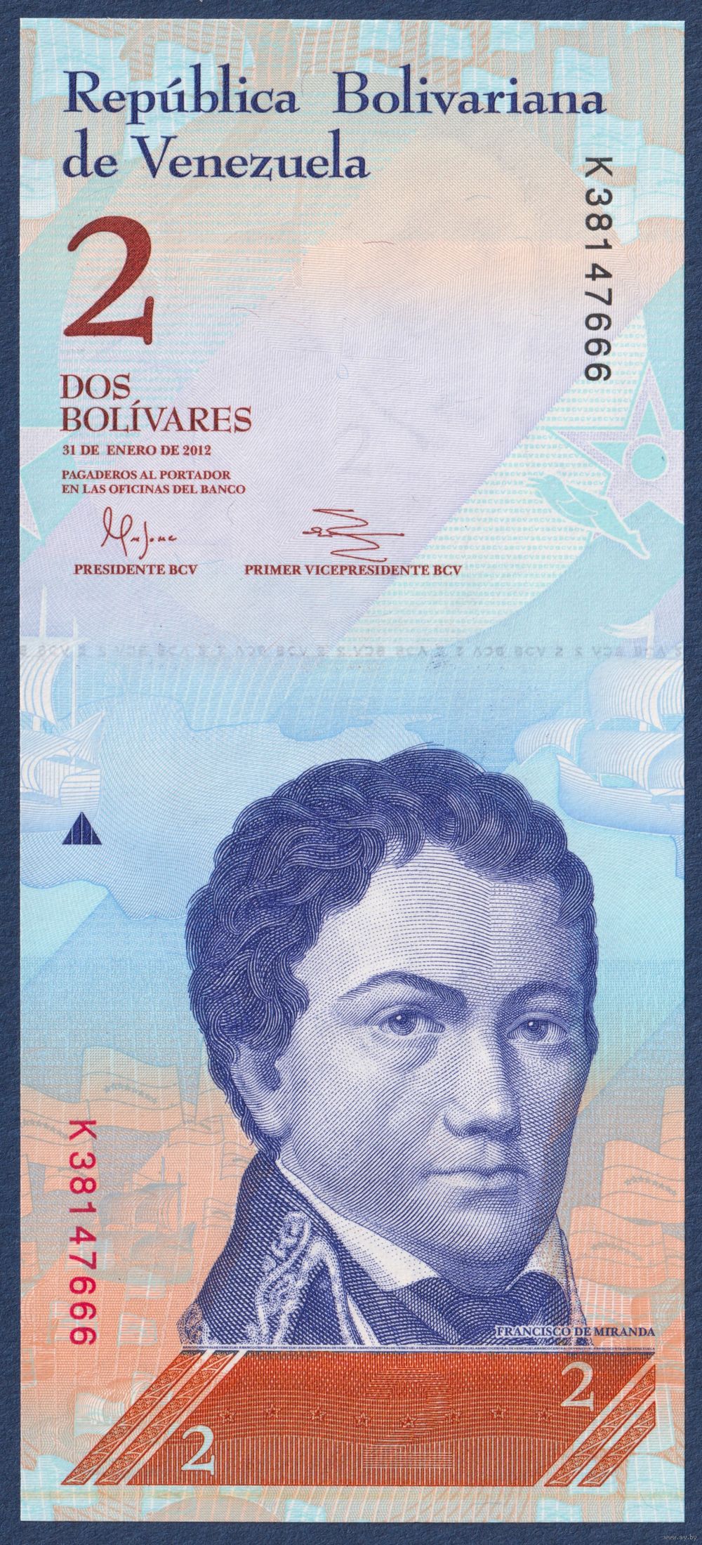 Венесуэла, 2 боливара 2012 г., P-88d (K, 31.01.2012, революционер Франсиско Миранда), UNC
