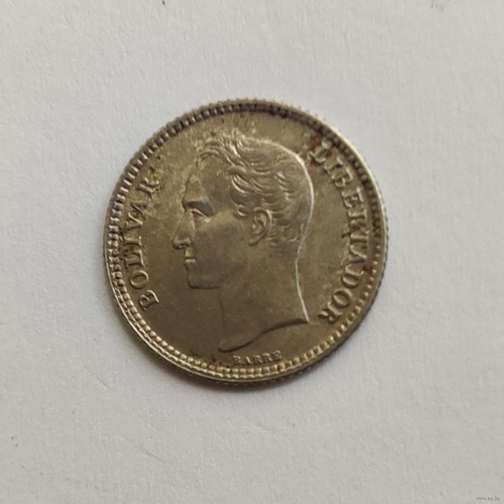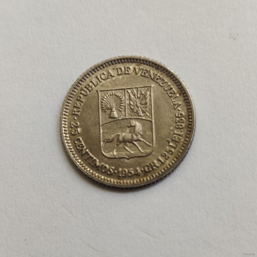 Номер Y# 35 Страна Венесуэла Период Республика Венесуэла (1953 - 1999) Валюта Венесуэльский боливар Вид чекана Регулярный чекан Номинал 25 сентимо Стоимость металла1,25 XAGg x 0,835 = 99 RUB Год 1954 Материал Серебро 0.835 Гурт Рубчатый Форма Круг Отношение авс/рев Монетное (180°) Вес (g) 1,25 Диаметр (mm) 16 Толщина (mm) 1,2