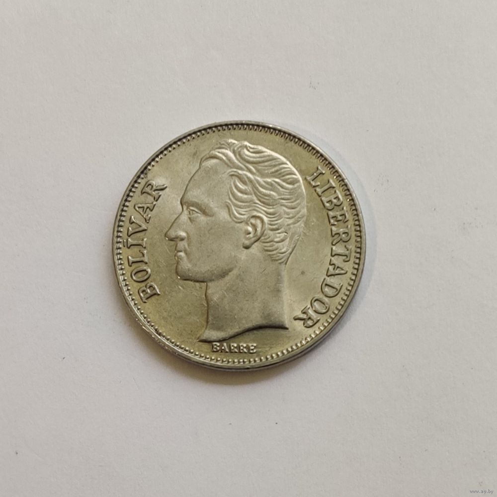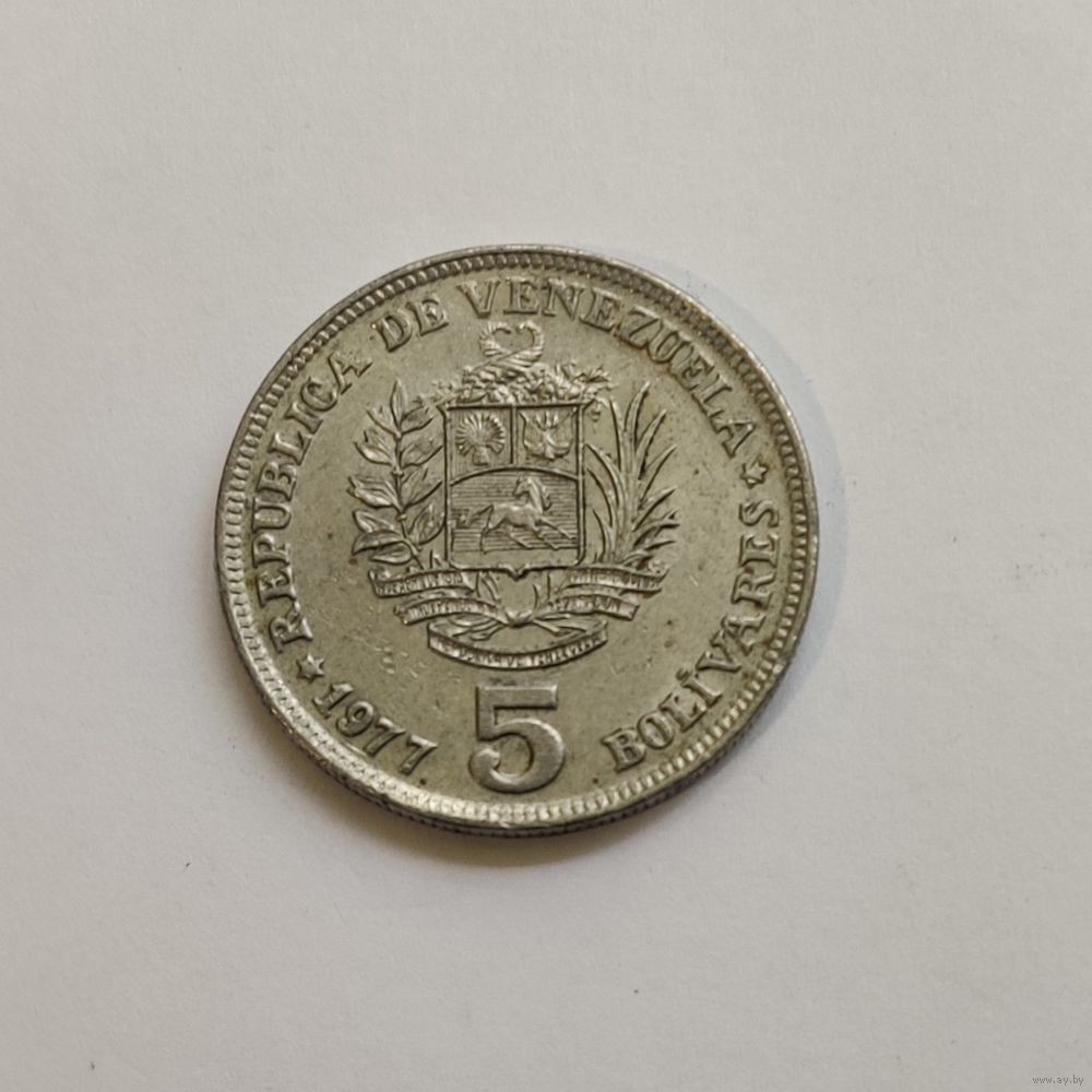 Номер Y# 53 Страна Венесуэла Период Республика Венесуэла (1953 - 1999) Валюта Венесуэльский боливар Вид чекана Регулярный чекан Номинал 5 боливаров Год 1977 - 1988 Материал Никель Гурт Рубчатый Форма Круг Отношение авс/рев Монетное (180°) Вес (g) 15 Диаметр (mm) 31 Толщина (mm) 2,5