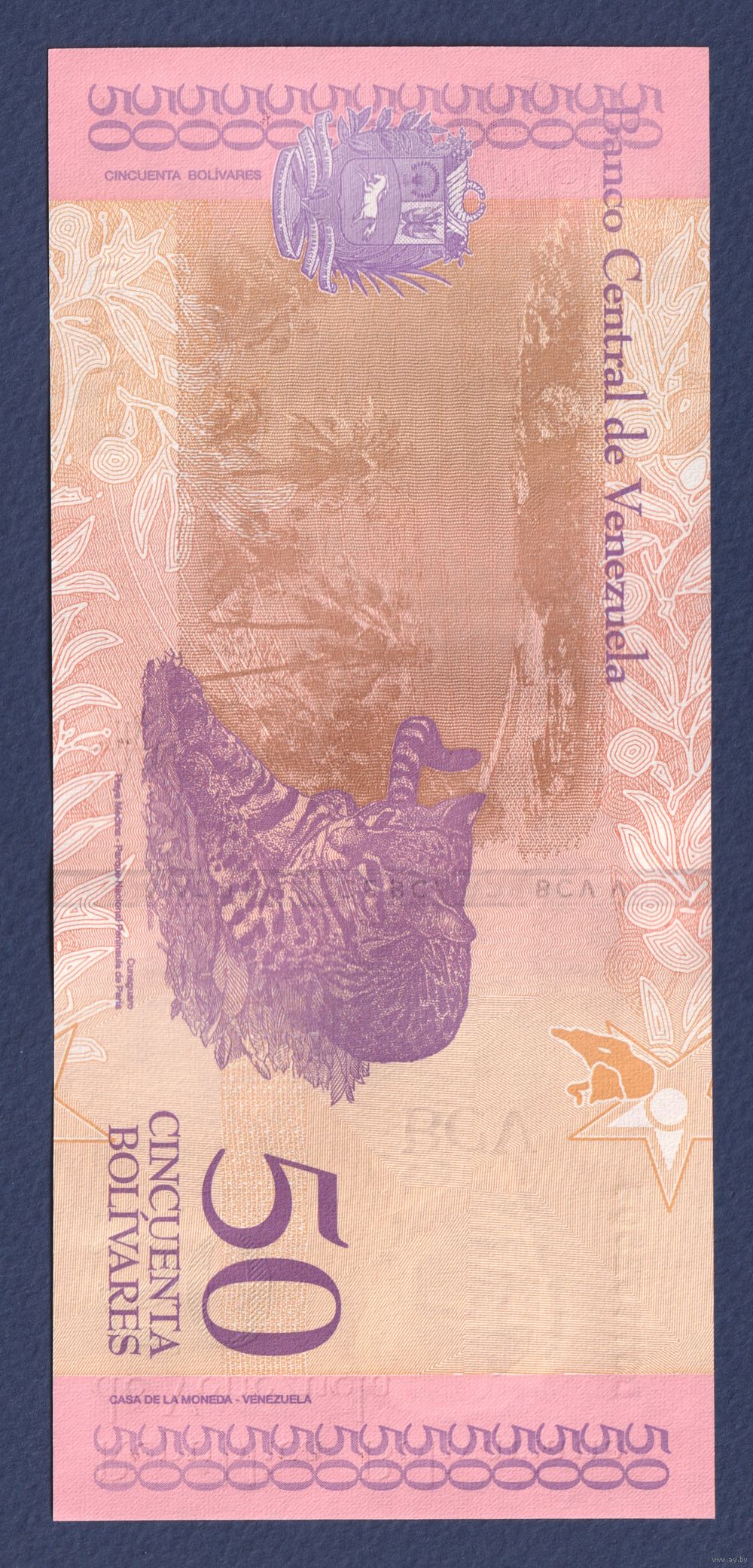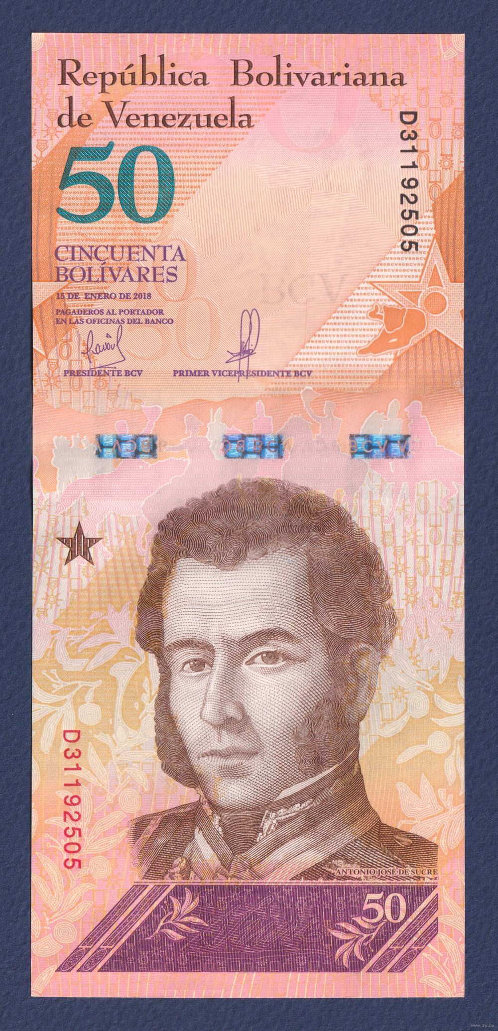 Венесуэла, 50 боливаров 2018 г, P-105 (15.01.2018, президент Антонио Хосе Сукре, кунагуаро), UNC