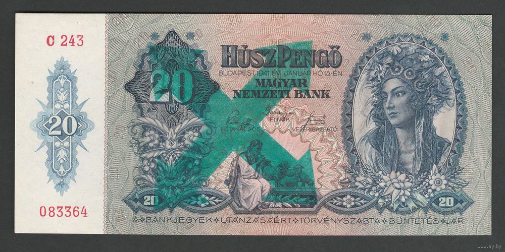 Венгрия 20 пенго 1941 года. С надпечаткой. Тип Р-109. Состояние аUNC