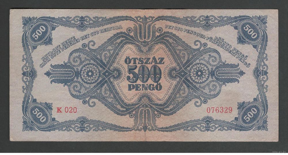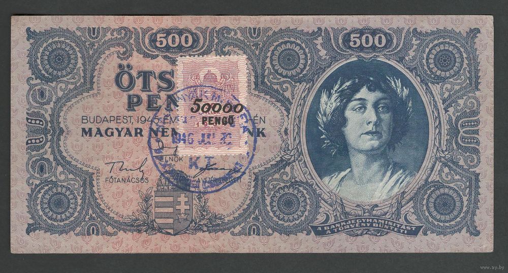 Венгрия 500 пенго 1945 года. С маркой и надпечаткой. Nятьсот. Тип P-117x. Состояние XF