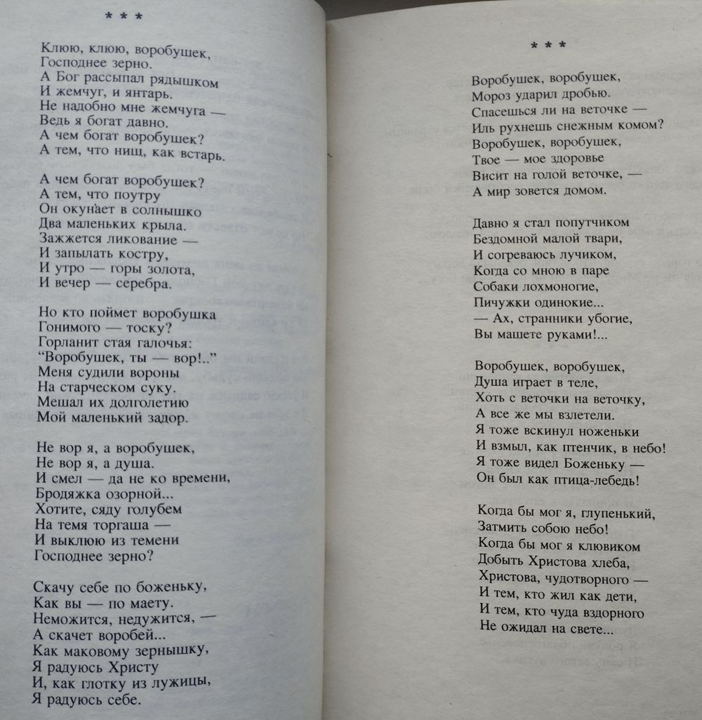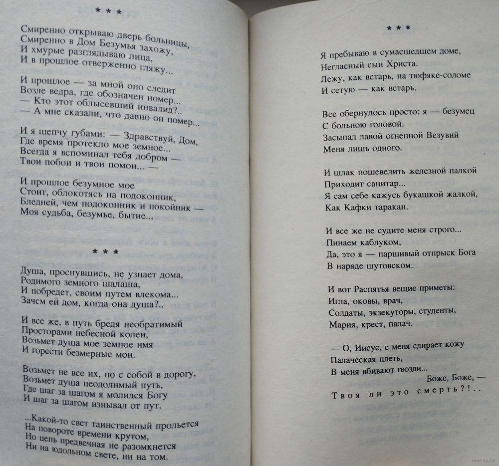Тираж 20000 экз. 299 стр. Этот человек был блаженным. В конце концов это стало его фамилией. Редко - но бывает: в читательский оборот вдруг входит поэт такого масштаба, что диву даешься - неужели его не замечали при жизни?! Замечали, признавали, высочайше оценивали! "Ваши стихи опять потрясли меня", - пишет поэту Арсений Тарковский. "Много лет я не слышал, не читал стихов такой силы и красоты", - вторит Александр Межиров. "Это поразительные стихи", - подтверждает Александр Кушнер... "Человек отчасти легендарный" - написал о поэте в своей антологии "Строфы века" Евгений Евтушенко. Есть уверенность, что с выходом "Сораспятья", итоговой книги поэта, это "отчасти" окончательно отпадет - легендарный.