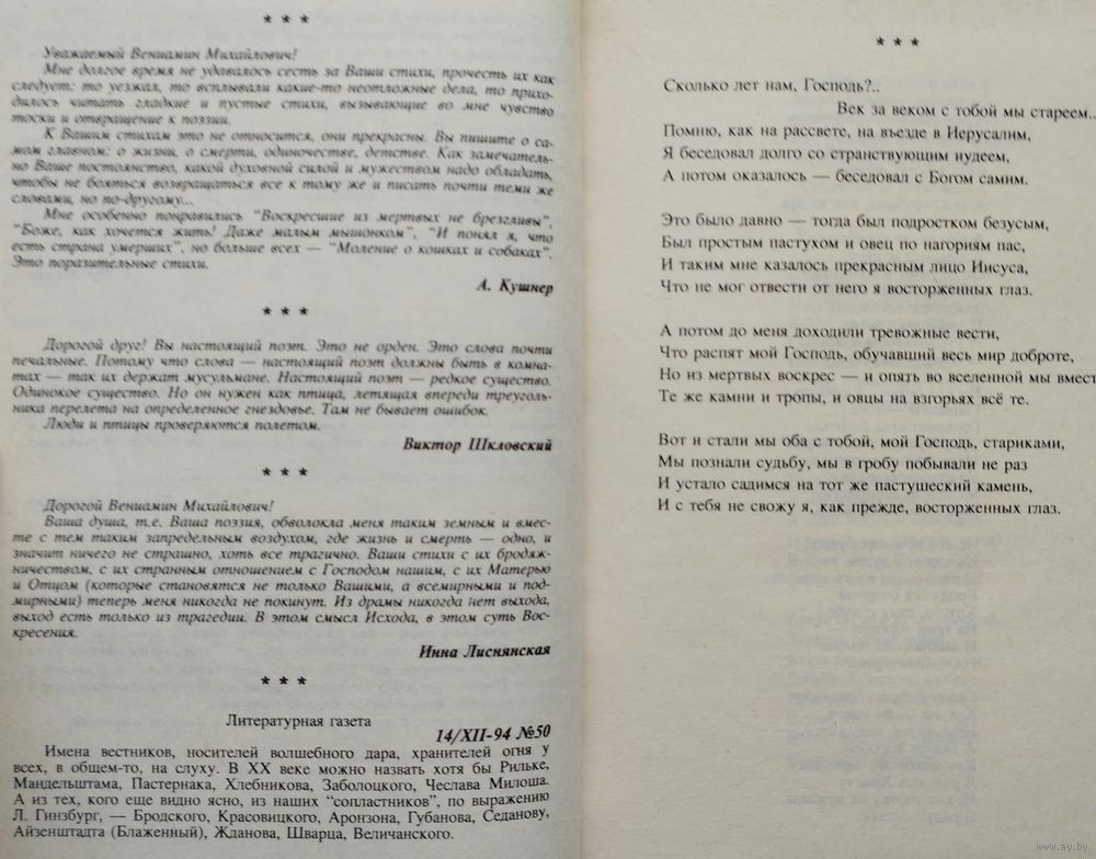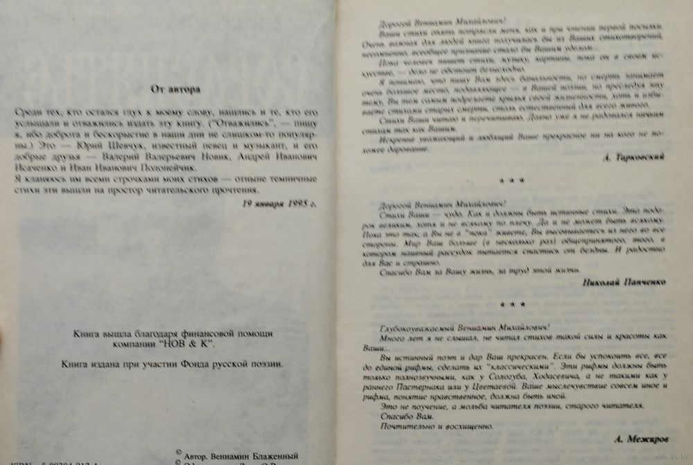 Тираж 20000 экз. 299 стр. Этот человек был блаженным. В конце концов это стало его фамилией. Редко - но бывает: в читательский оборот вдруг входит поэт такого масштаба, что диву даешься - неужели его не замечали при жизни?! Замечали, признавали, высочайше оценивали! "Ваши стихи опять потрясли меня", - пишет поэту Арсений Тарковский. "Много лет я не слышал, не читал стихов такой силы и красоты", - вторит Александр Межиров. "Это поразительные стихи", - подтверждает Александр Кушнер... "Человек отчасти легендарный" - написал о поэте в своей антологии "Строфы века" Евгений Евтушенко. Есть уверенность, что с выходом "Сораспятья", итоговой книги поэта, это "отчасти" окончательно отпадет - легендарный.
