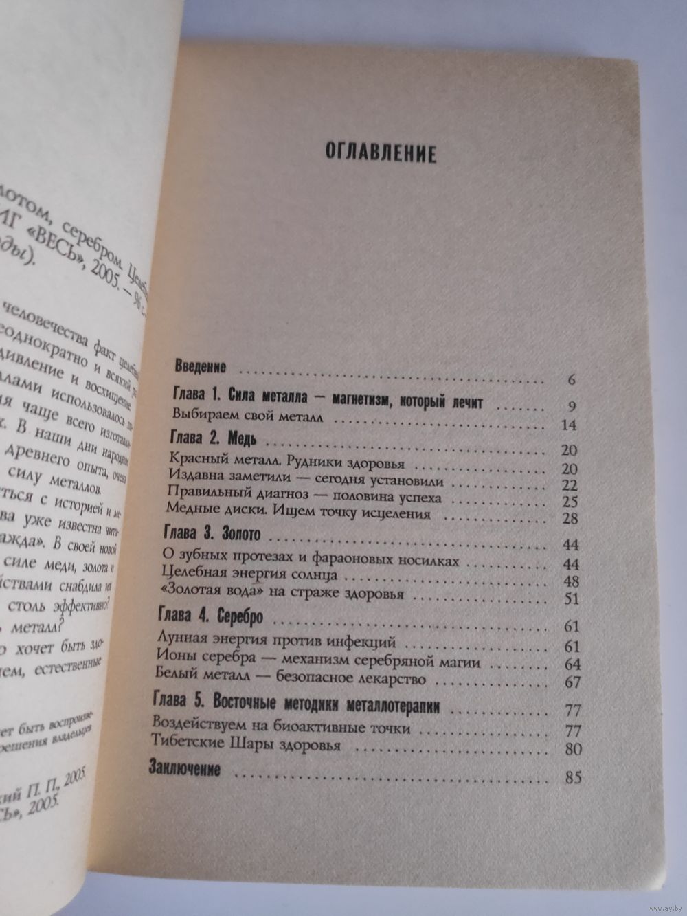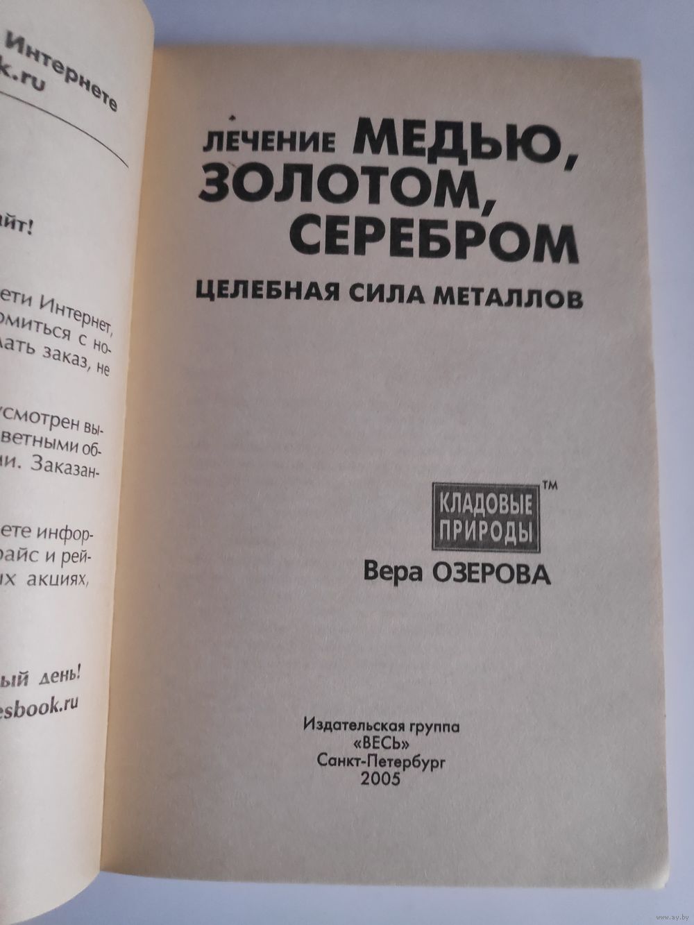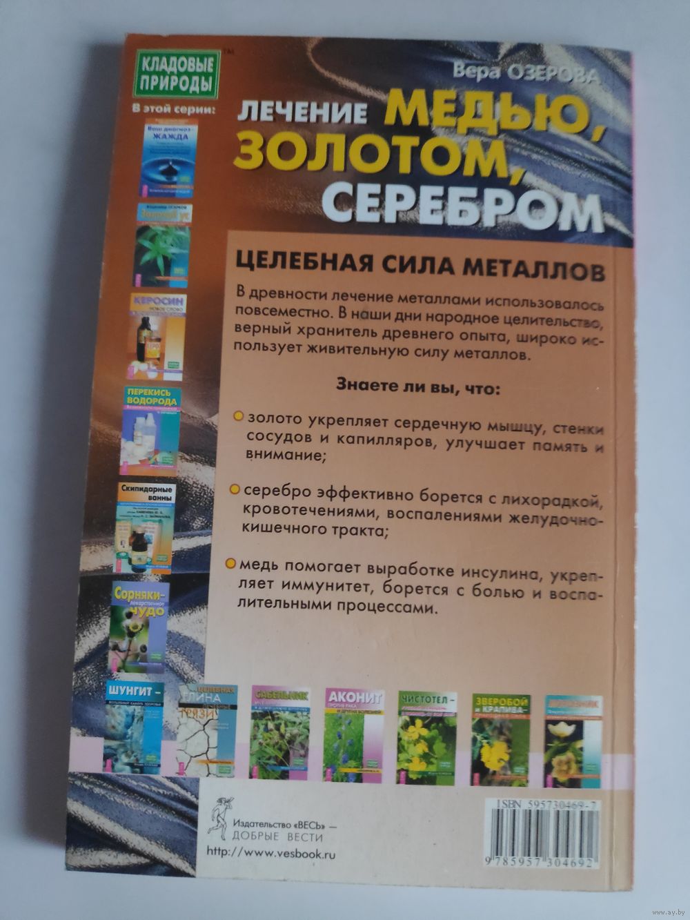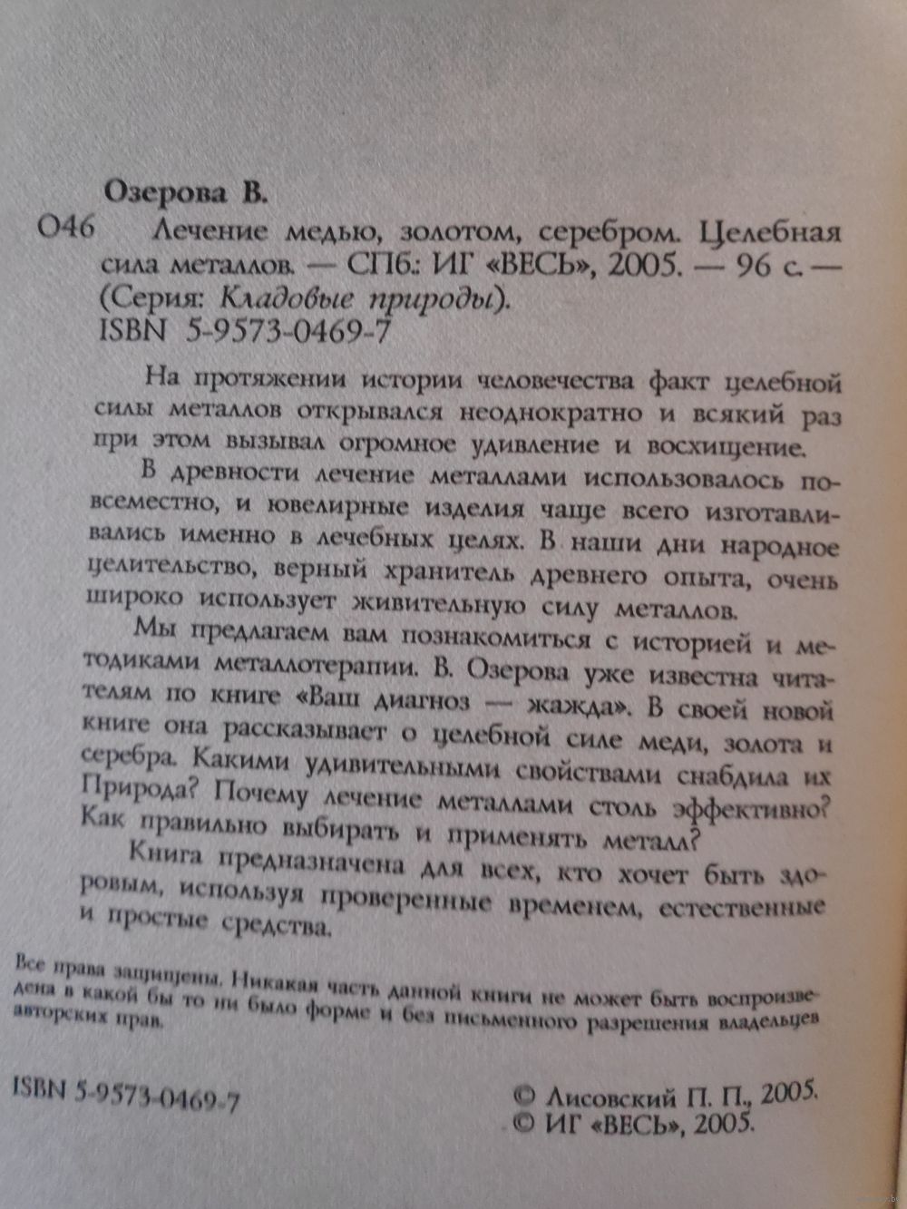 На протяжении истории человечества факт целебной силы металлов открывался неоднократно и всякий раз при этом вызывал огромное удивление и восхищение.В древности лечение металлами использовалось повсеместно, и ювелирные изделия чаще всего изготавливались именно в лечебных целях. В наши дни народное целительство, верный хранитель древнего опыта, очень широко использует живительную силу металлов.Мы предлагаем вам познакомиться с историей и методиками металл терапии. В. Озерова уже известна читателям по книге «Ваш диагноз - жажда». В своей новой книге она рассказывает о целебной силе меди, золота и серебра. Какими удивительными свойствами снабдила их Природа? Почему лечение металлами столь эффективно Как правильно выбирать и применять металлКнига предназначена для всех, кто хочет быть здоровым, используя проверенные временем, естественные и простые средства.Все права защищены, Никакая часть данной книги не может быть воспроизведена в какой бы то ни было форме и бел письменного разрешения владельцев авторских прав.