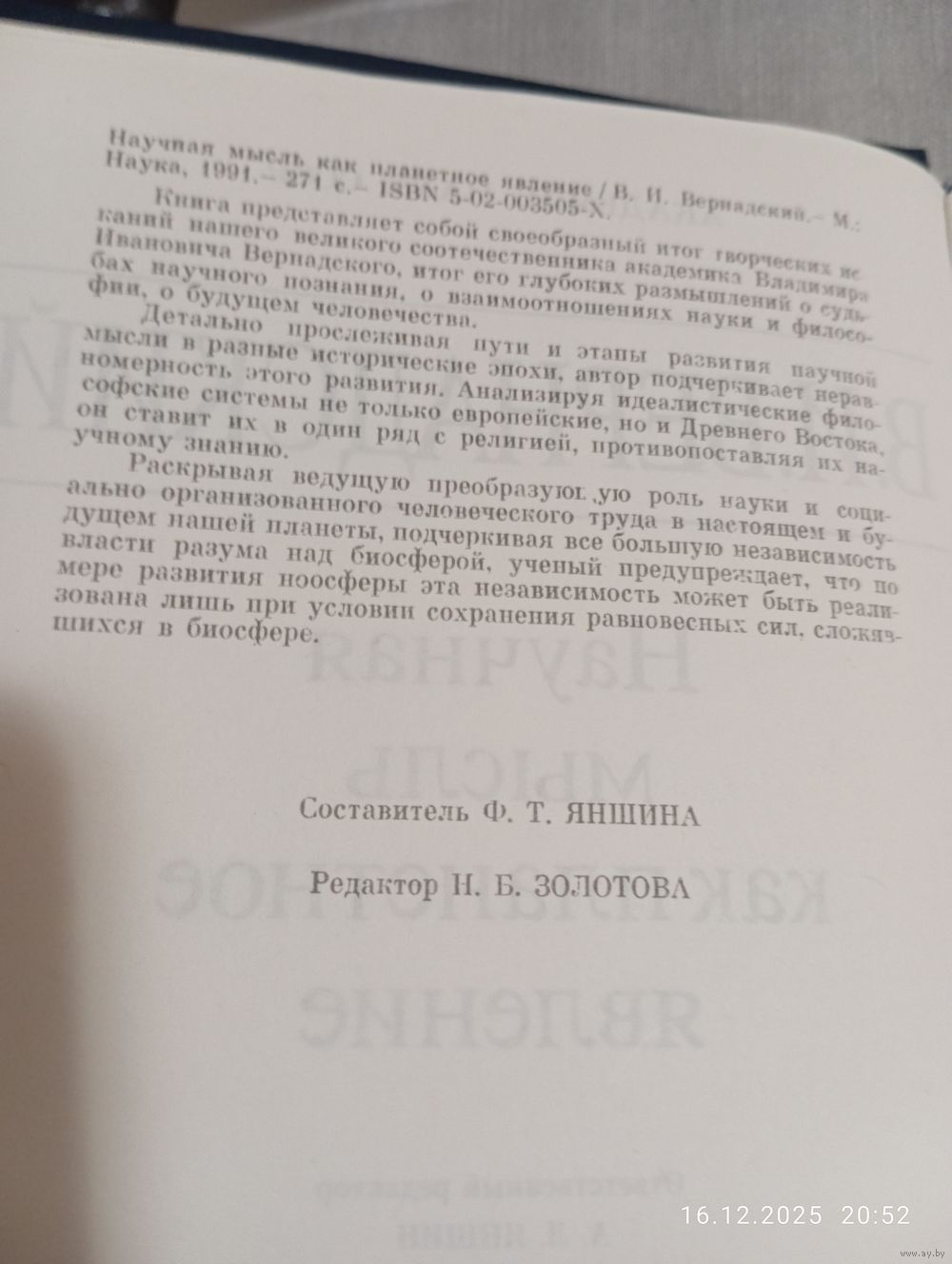 Вернадский В. Научная мысль как планетное явление. М. Наука 1991. В хорошем состоянии, тв переплет. 271 с. Возможность отправки Белпочтой, полная предоплата