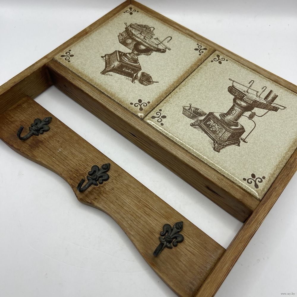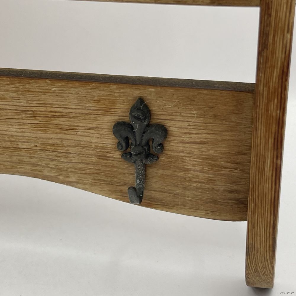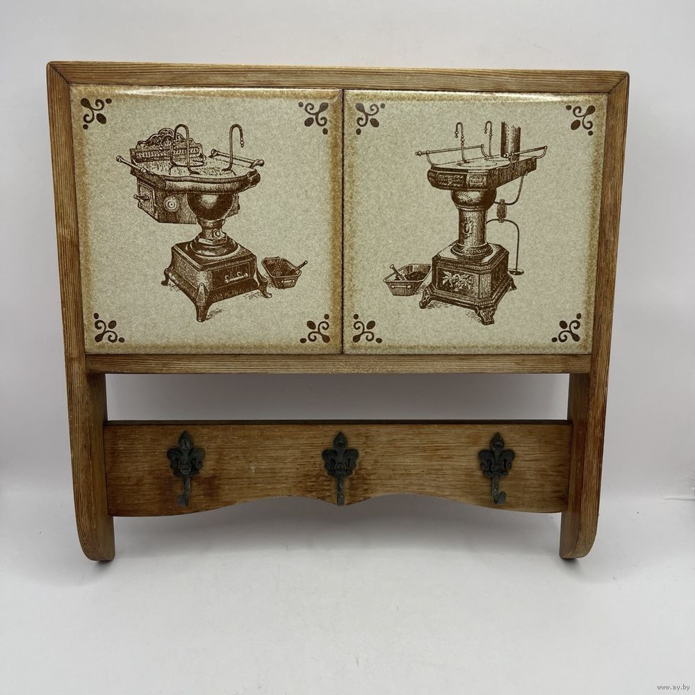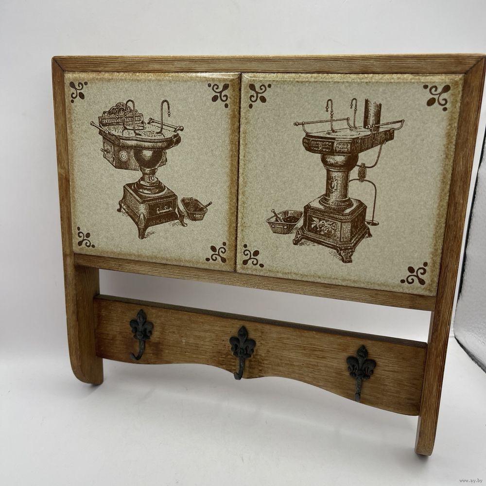 Винтажная вешалка для кухонных полотенец с декоративными керамическими плитками, деревянное панно с металлическими крючками в виде геральдических лилий. Германия. 1960-е г.г. Размер 23,5 х 3 х 22,5 см. Вес 680 г. Деревянная часть со следами времени и бытования.