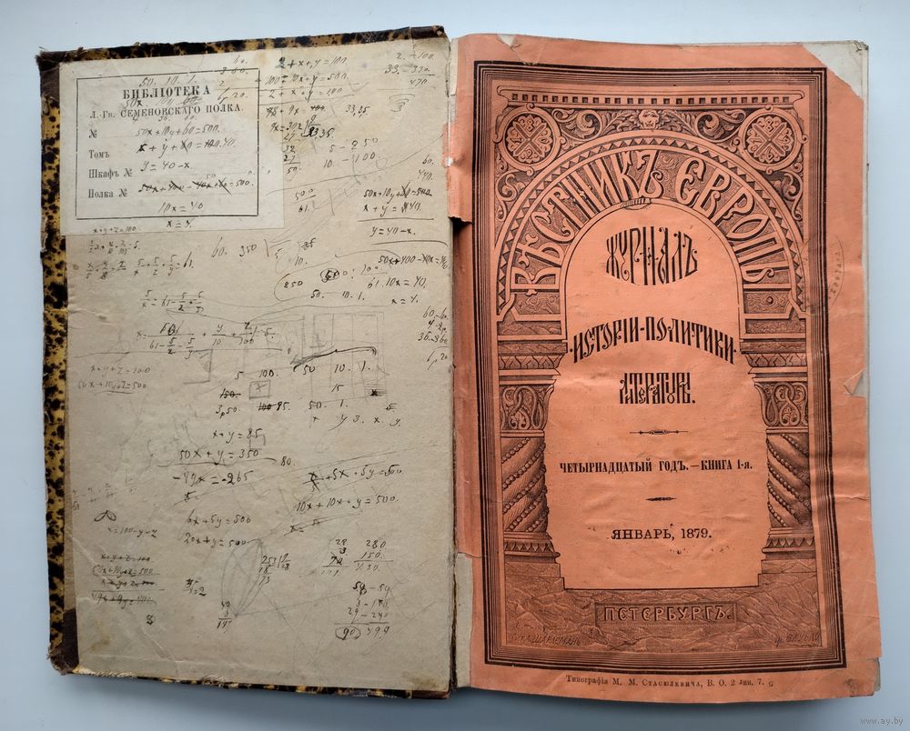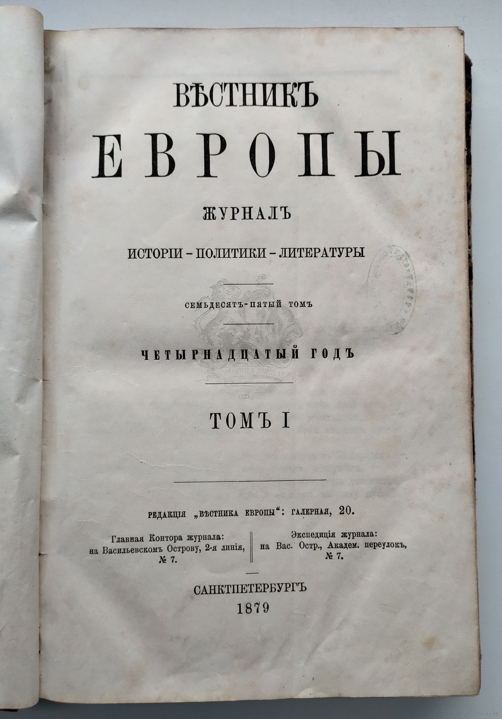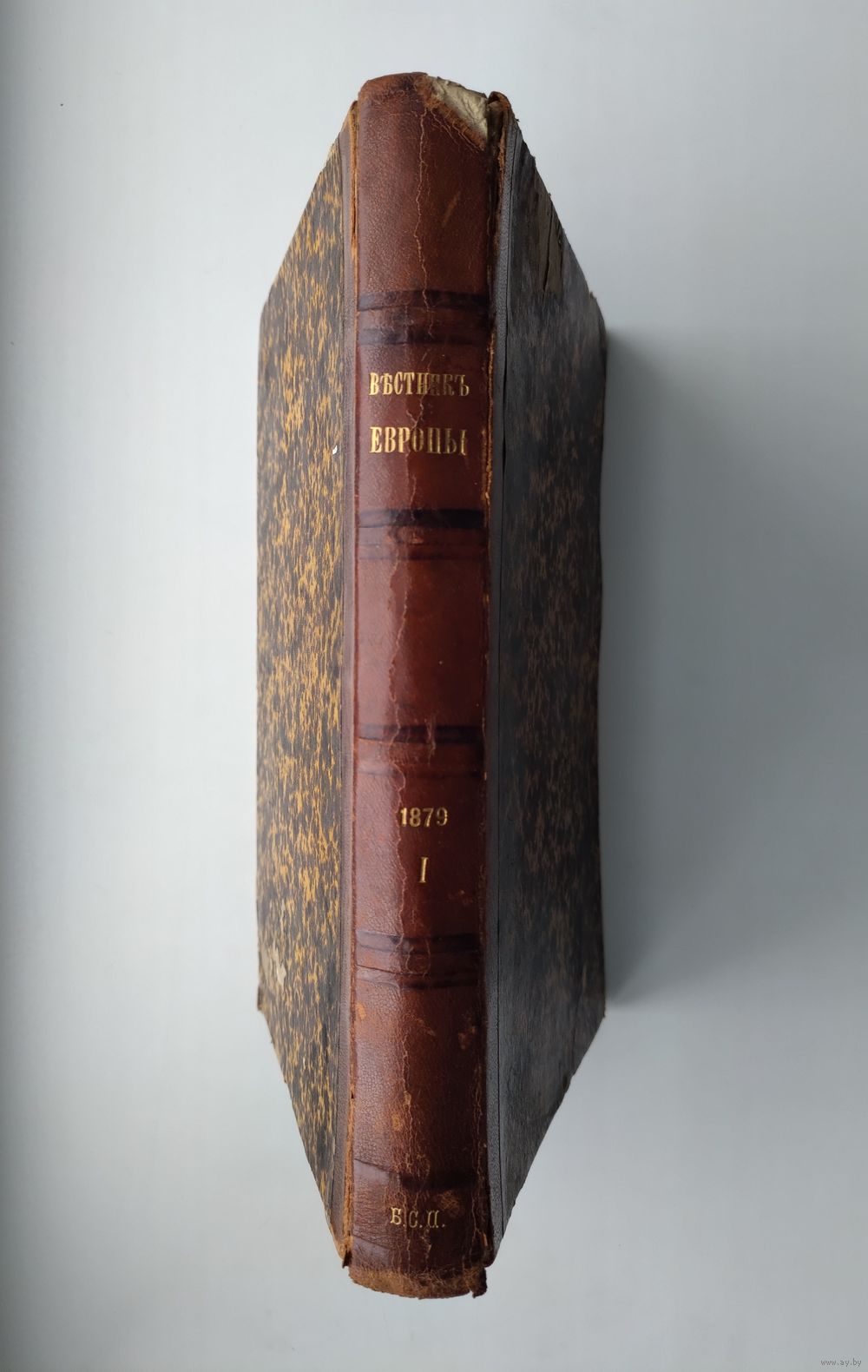 Вестник Европы. 1879 год. Семьдесят-пятый томъ. Четырнадцатый год. Томъ I. Журнал истории, политики, литературы. СПб.: Типография М. Стасюлевича, 1879г., 448с. Твёрдый картонный переплёт эпохи с кожаным корешком с золотым тиснением. Крышки под камень. Увеличенный формат.
