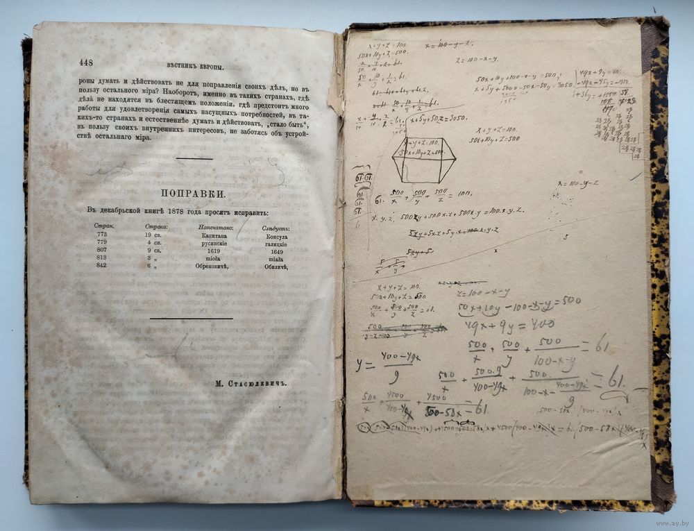| маргиналии - математические вычисления - на форзаце и нахзаце. Побит и лопнул корешок. На части страниц есть пятна (на фото 9 похуже). | |