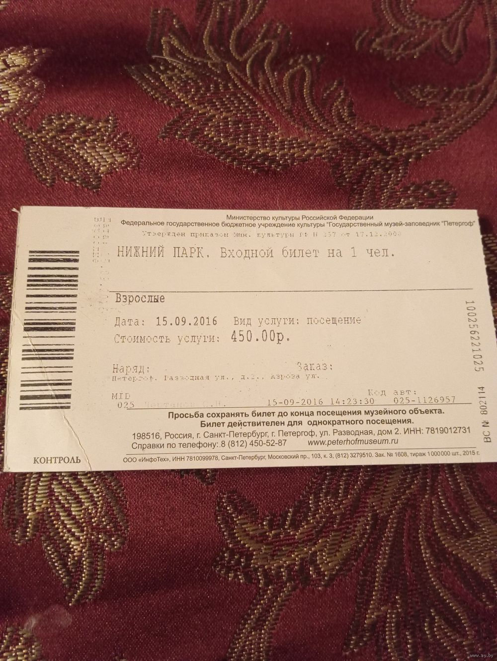 входной билет в Государственный музей-заповедник «Петергоф».