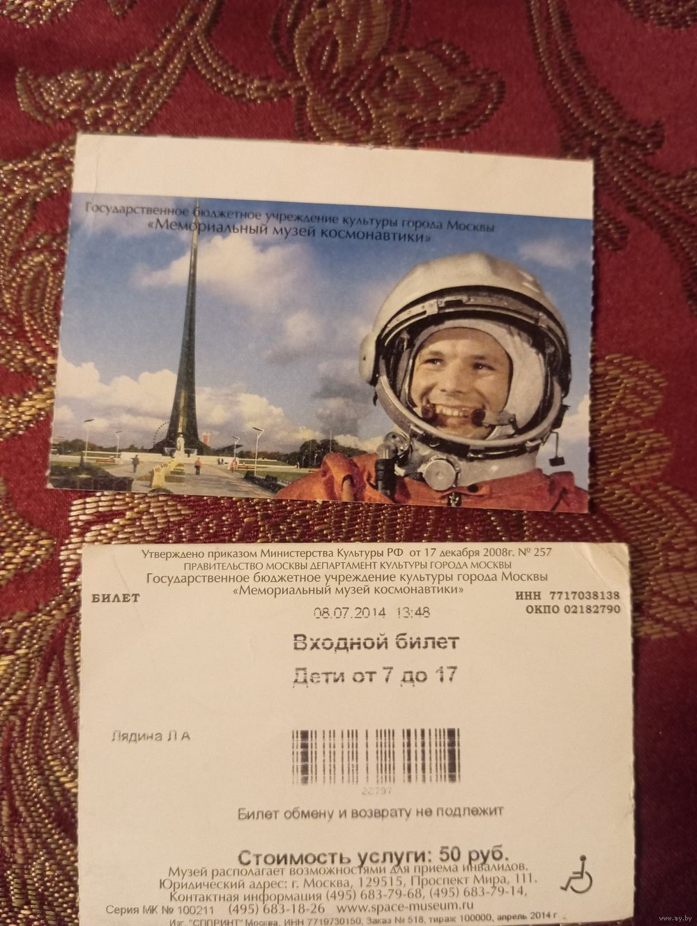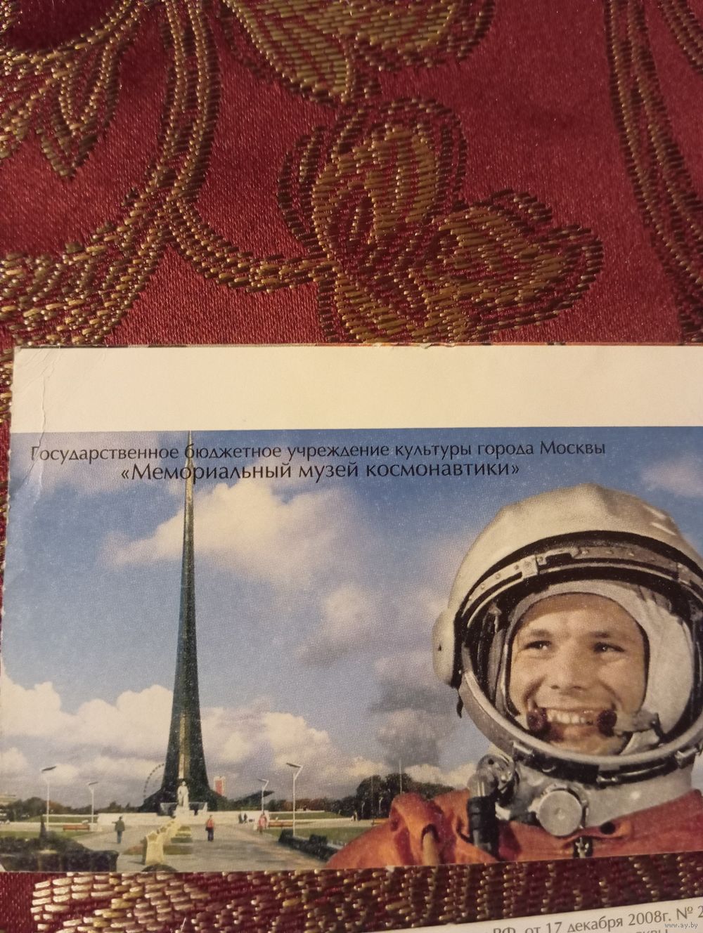 открытка, посвященная Мемориальному музею космонавтики в Москве. На ней изображен улыбающийся Юрий Гагарин, первый человек в космосе, а на заднем плане виден монумент «Покорителям космоса». Мемориальный музей космонавтики